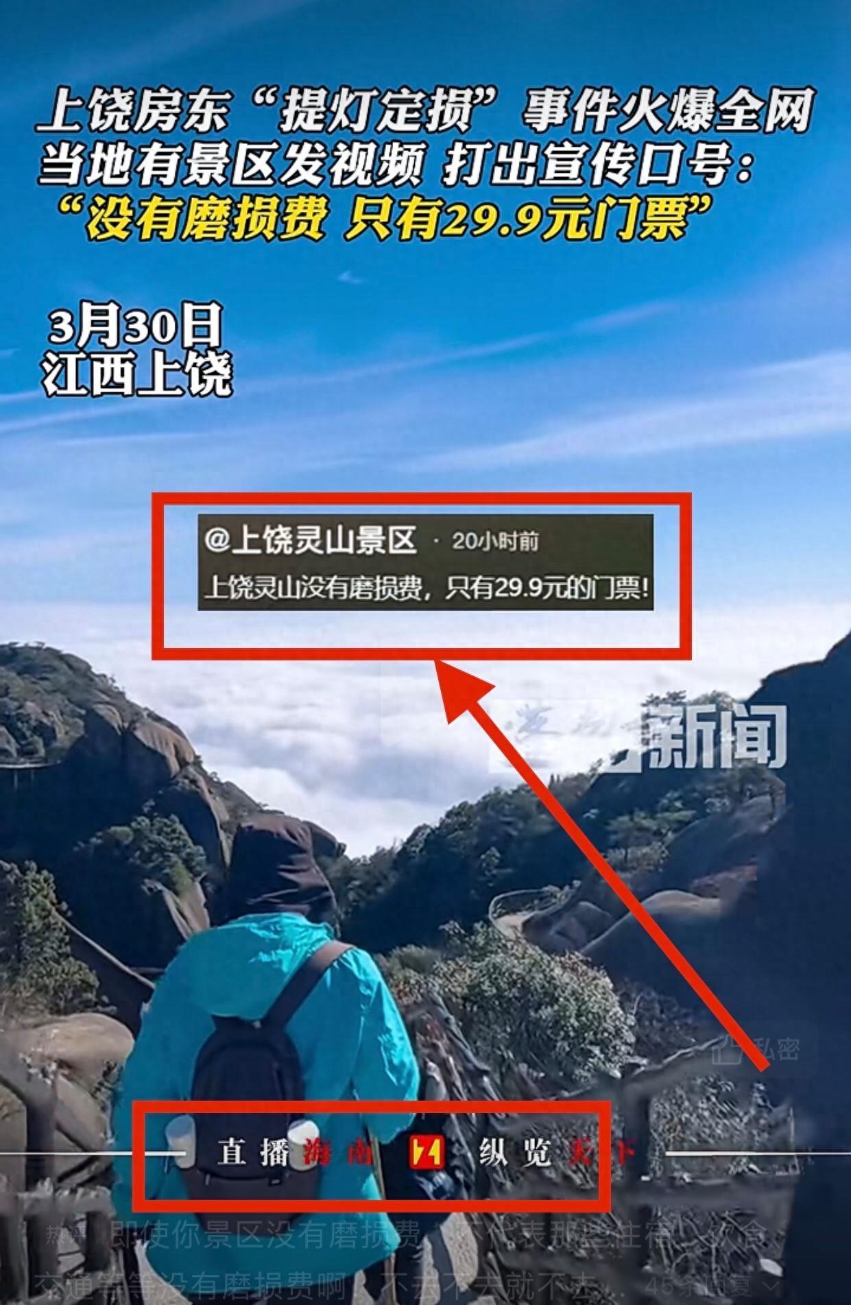 這波潑天流量,本來是一件不光彩事情,根據《直播海南》等多家媒體報道,上饒靈山景區藉助這波流量來個反向宣傳,聲稱上饒靈山景區門票重回29.9元,還喊話全國網友來靈山旅遊,靈山門票只要29.9元,沒有磨損費。