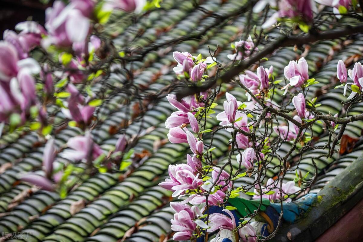 成都有許多地方因花得名,浣花溪就是其中之一。這條流過千年風雨滄桑、流進古都文化血脈的溪流,自古便是人文薈萃之地,留下了衆多文人騷客的足跡和吟詠,最爲突出的便是杜甫。當時杜甫流落成都,在溪邊修了幾間茅屋安身,直到“劍外忽傳收薊北”“漫卷詩書喜欲狂”時方纔離川。如今,這裏建起了杜甫草堂,一直是成都人清明出遊的首選之地。春天的杜甫草堂百花爭豔,尤以玉蘭花事最盛。玉蘭花們或傍曲徑盛開,或鄰詩碑綻放,或於庭院吐蕊,玉樹臨風,娉婷高潔。其中又以白玉蘭爲主,潔白如玉的花朵,默然點綴着草堂的亭臺樓閣,無聲吟誦着杜甫的詩篇。也有一些紫玉蘭,開着淡紫色的花朵,以不落流俗的色彩,輝映着草堂主人不滅的詩魂。
