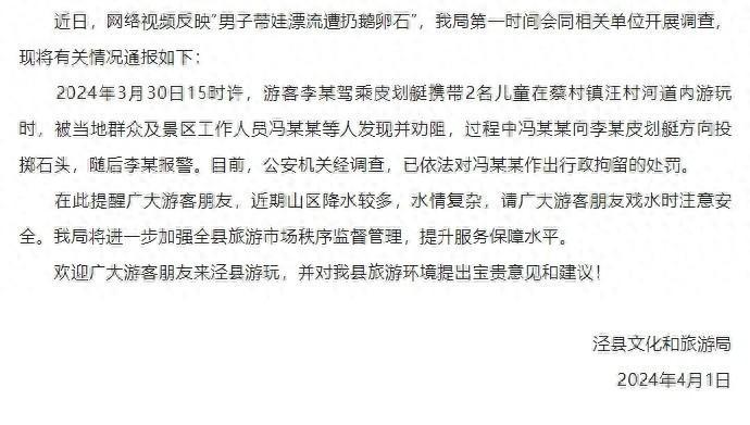 4月1日,安徽涇縣文化和旅遊局通報“男子帶娃漂流遭扔鵝卵石”事件:近日,網絡視頻反映“男子帶娃漂流遭扔鵝卵石”,我局第一時間會同相關單位開展調查,現將有關情況通報如下: