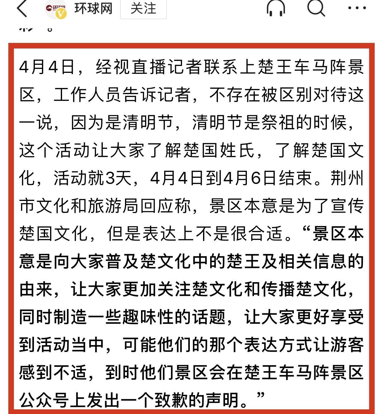 4月4日,之前發佈楚國姓氏文化免門票或者半票活動文章,湖北文旅官方賬號已經刪除了。