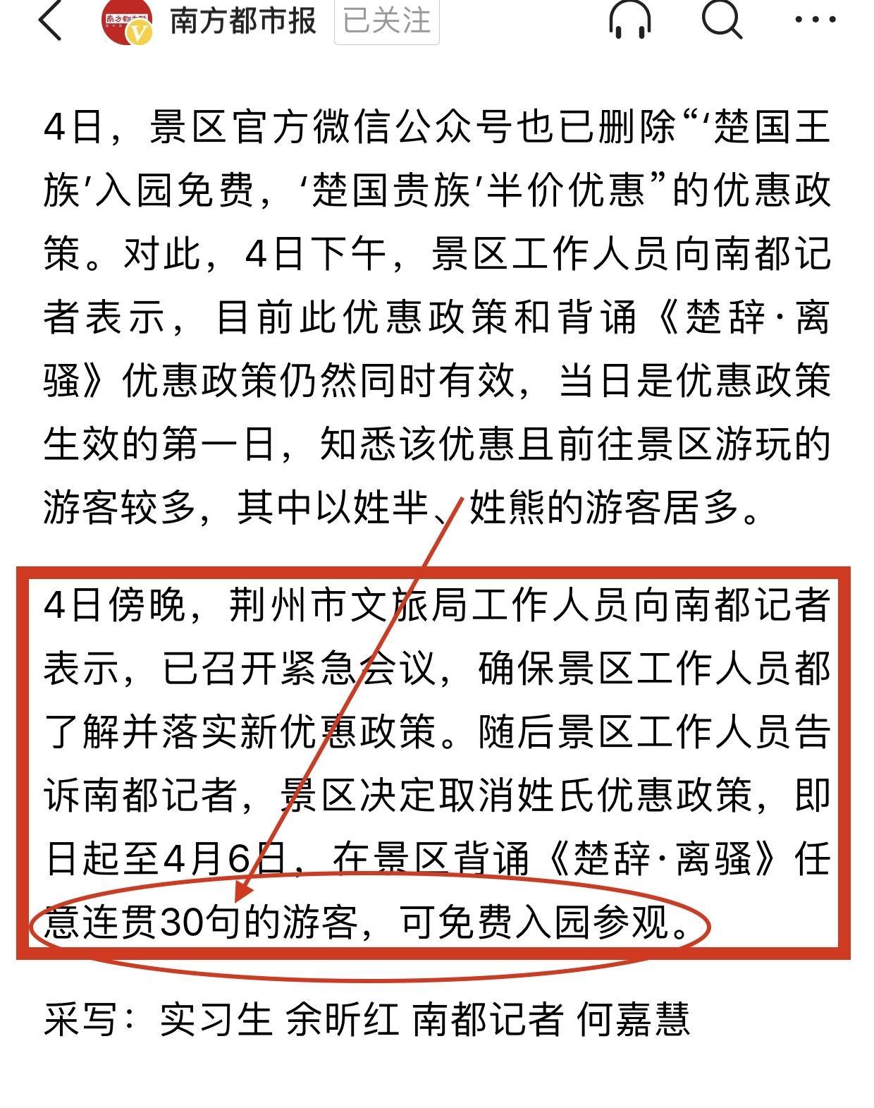 根據《南方都市報》最新消息,景區已經取消了這個姓氏免門票活動,改成背誦《楚辭、離騷》免門票活動。