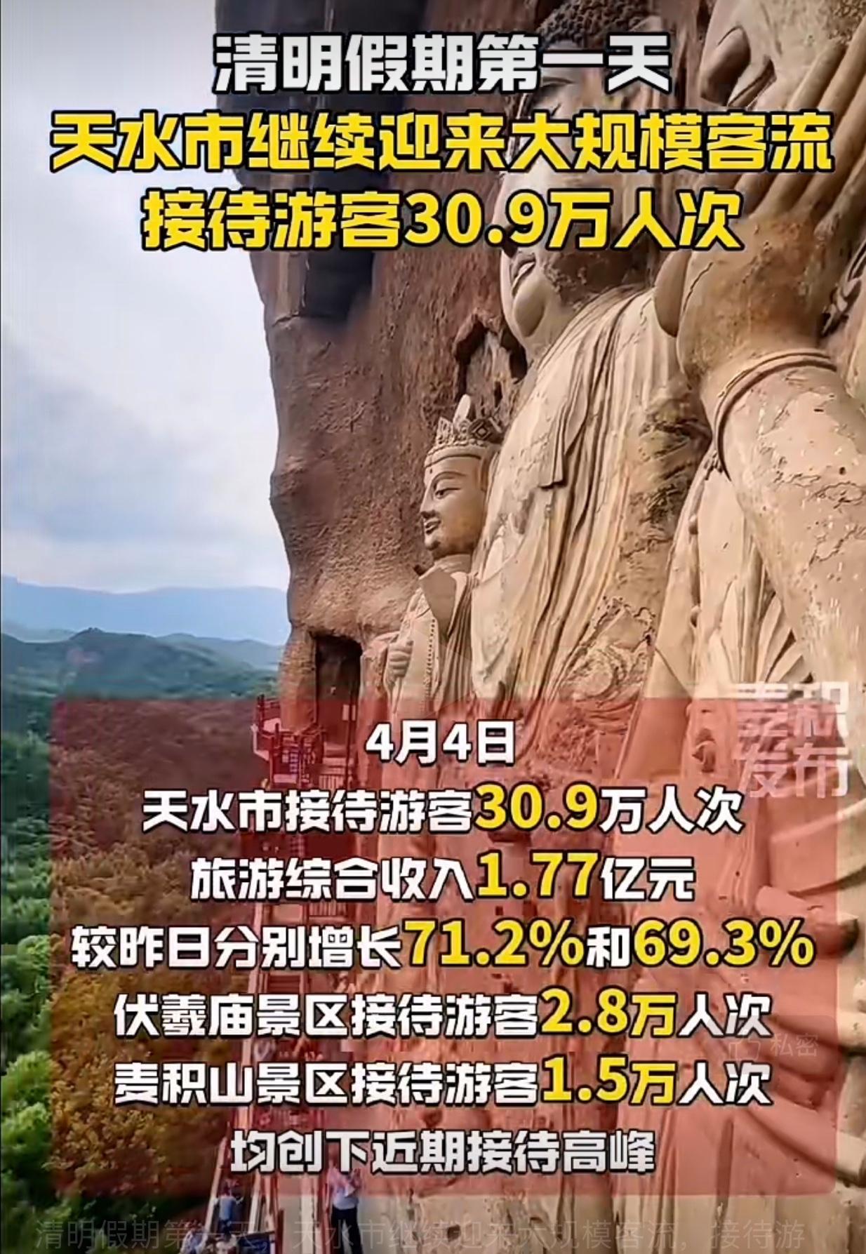 3、天水麻辣燙,火爆出圈之後,單三月份一個月,天水市累計接待遊客389萬人次,實現旅遊綜合收入22.5億元,清明節假期天水單日就是接待30萬人次遊客,實現旅遊收入一億多元,進天水路上車水馬龍,美食街,景區人潮洶湧,伏羲廟景區單日接待遊客2.8萬人,麥積山石窟景區單日接待遊客1.5萬人,一碗麻辣燙帶火天水旅遊,讓這個有2000多年曆史古城走入大衆視野,深層次問題是背後有深厚歷史文化底蘊,還有熱情好客天水人助力,流量是一把雙刃劍,用得好可以讓一座城市富甲一方,希望天水旅遊藉助這波流量永遠紅下去,爭做下一個敦煌。