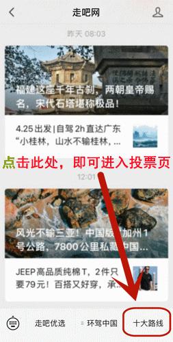投票通道 :微信進入走吧網公衆號主頁,點擊底部功能欄“十大路線”,進入投票專頁。