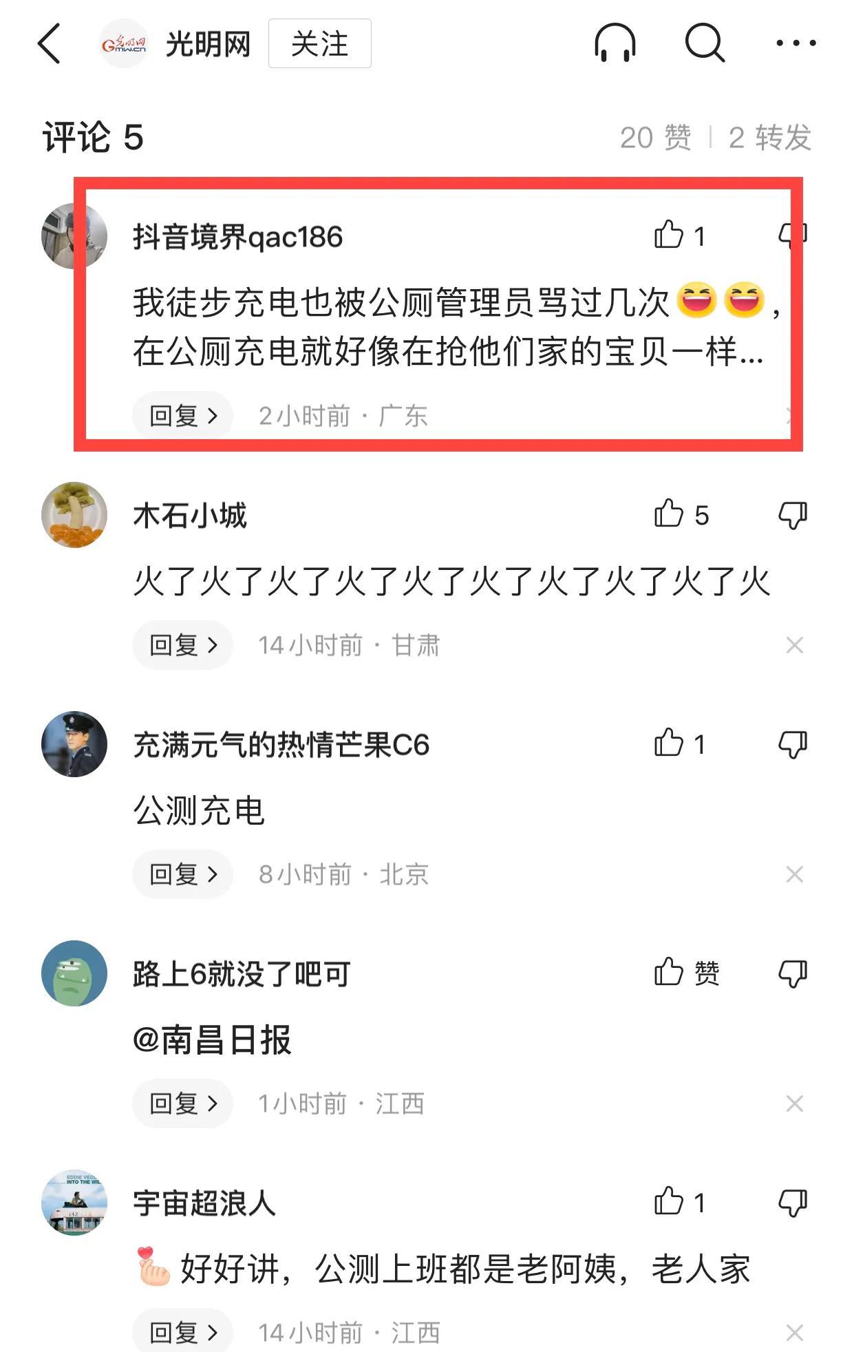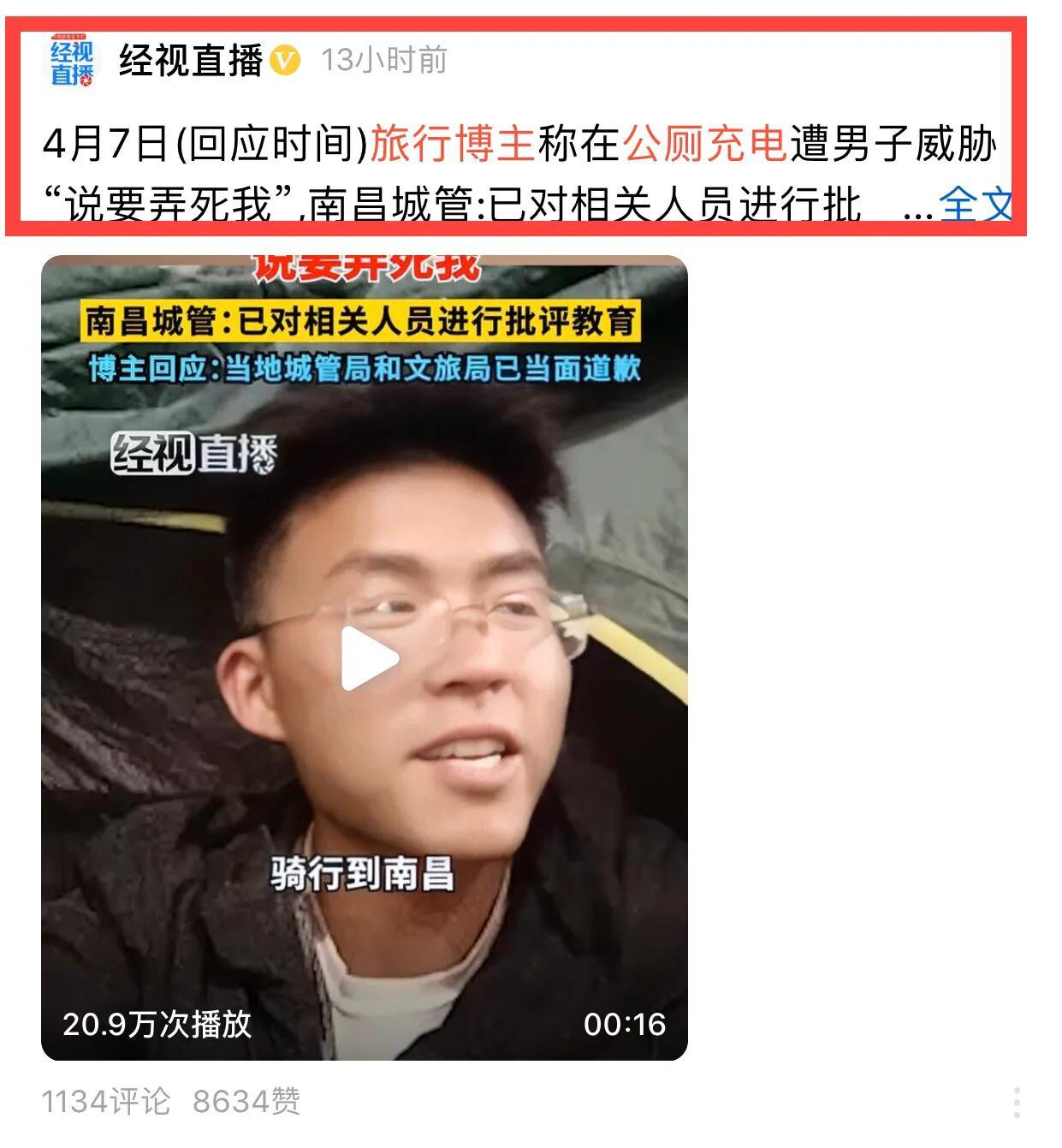 #旅行博主稱在南昌公廁充電被威脅##男子在南昌一公廁充電遭言語威脅##騎行博主稱在南昌公廁充電遭威脅##南昌城管通報“男子在公廁充電被威脅”#