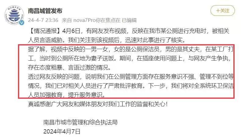 4、視頻在網上引起輿論關注,多家官媒報道,2024年4月7日,南昌當地文旅局和城管局反應迅速,找到了這位露營騎行者,當面給他道歉,查明公廁兩位工作人員一男一女系夫妻關係,女的是公廁保潔員,男的是在一個公廠上班,男的是來爲妻子送飯,雙方就充電發生口角,對威脅他的男子進行啦批評教育,後期會對南昌公廁保潔員進行加強培訓,提升服務意識。