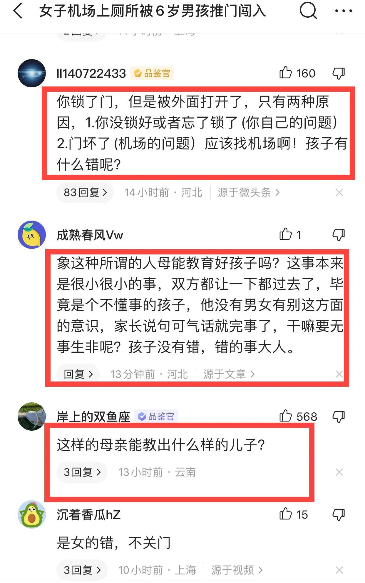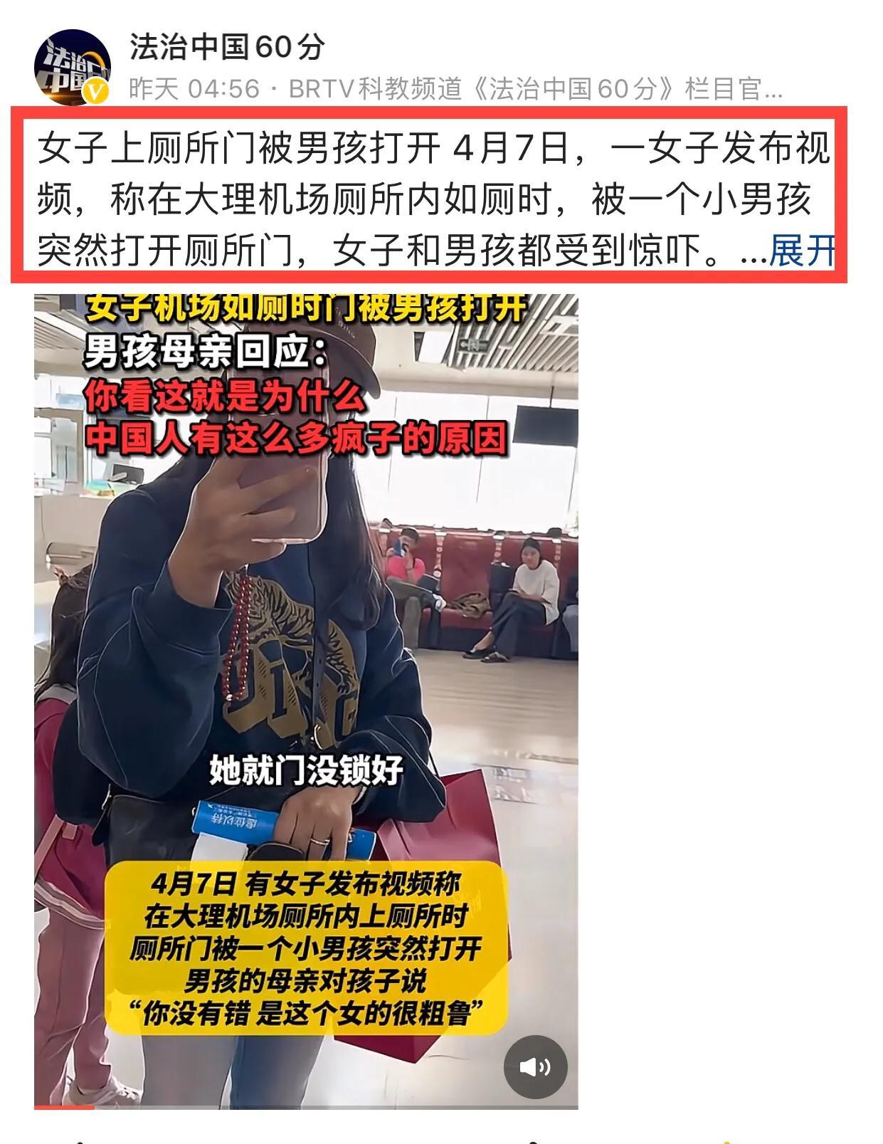 雲南大理女子機場上廁所,被6歲男孩推開門,母親不道歉,反而指責女遊客太粗俗,瘋子。