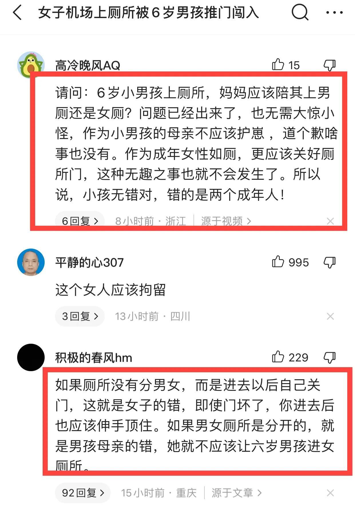 4、請問:6歲小男孩上廁所,媽媽應該陪其上男廁還是女廁?問題已經出來了,也無需大驚小怪,作爲小男孩的母親不應該護崽 ,道個歉啥事也沒有。作爲成年女性如廁,更應該關好廁所門,這種無趣之事也就不會發生了。所以說,小孩無錯對,錯的是兩個成年人!