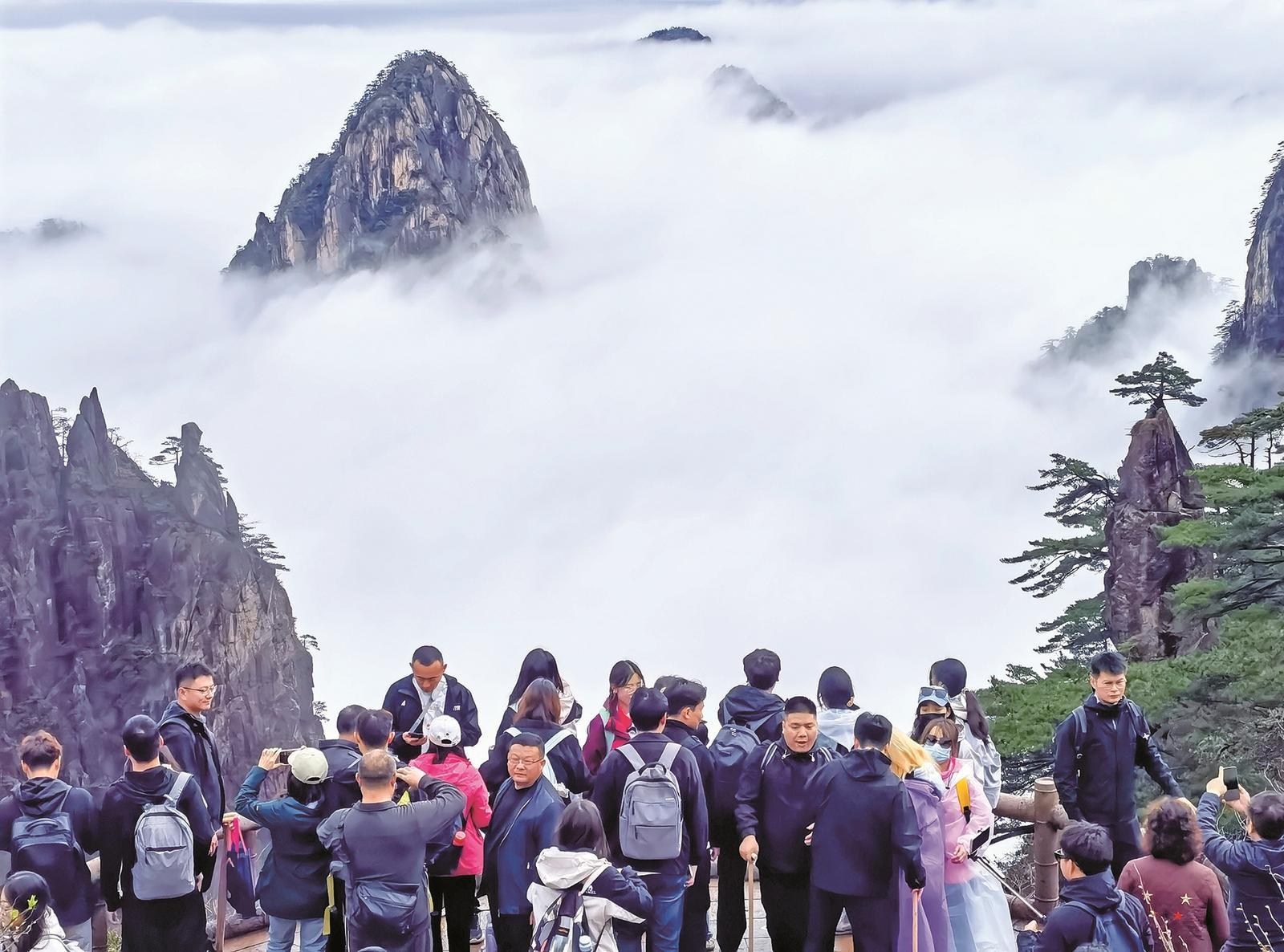 4月6日,安徽黃山景區雲霧縹緲,彷彿一幅流動的水墨畫。圖爲遊客欣賞黃山雲海。張寧 攝