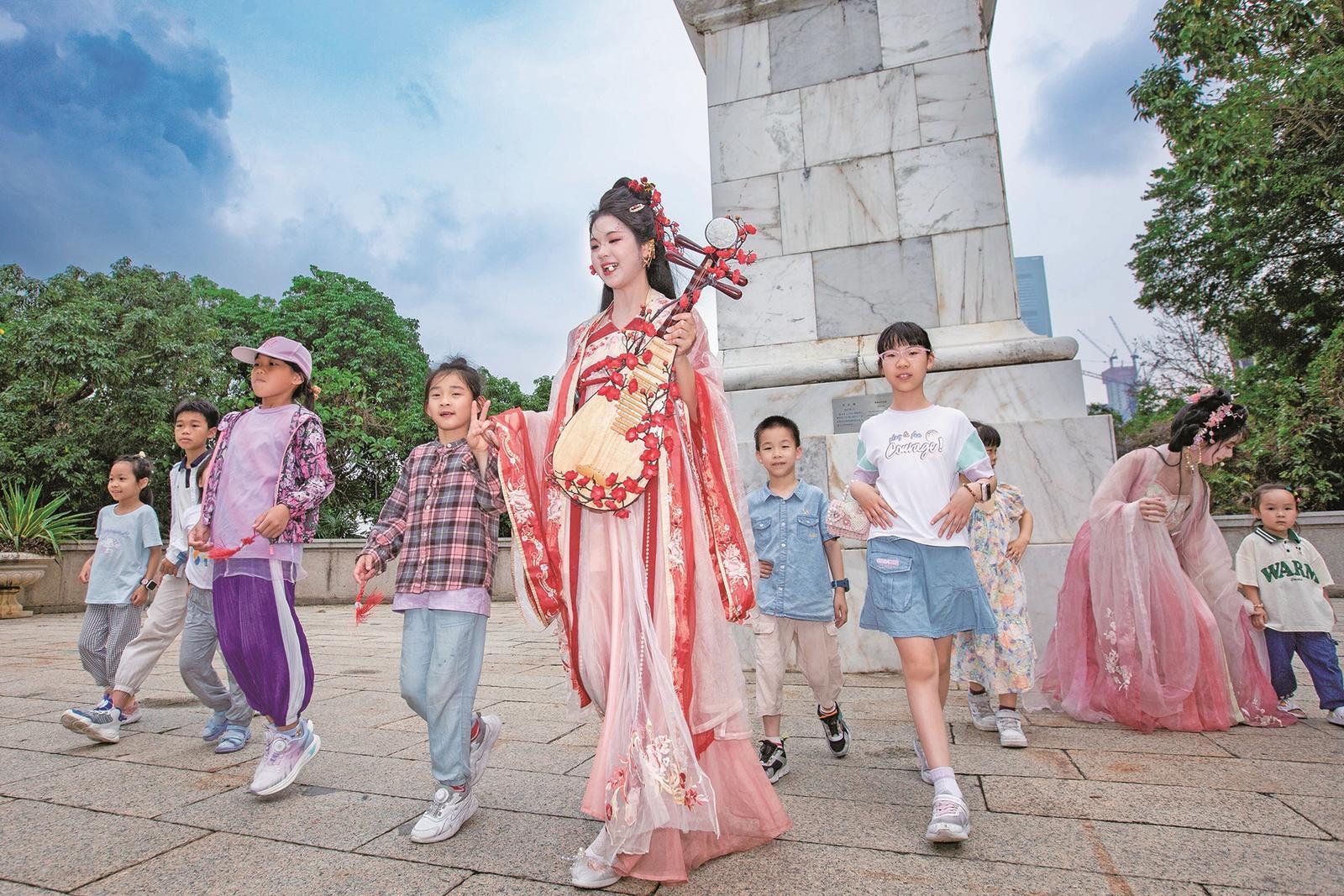 清明假期,深圳世界之窗景區推出首屆深圳漢服節、“世界十二花神”巡遊、漢服同袍大巡遊、國風集市、煙花之舞等活動。圖爲身着漢服的“花神”扮演者與小遊客互動。 深圳世界之窗景區 供圖