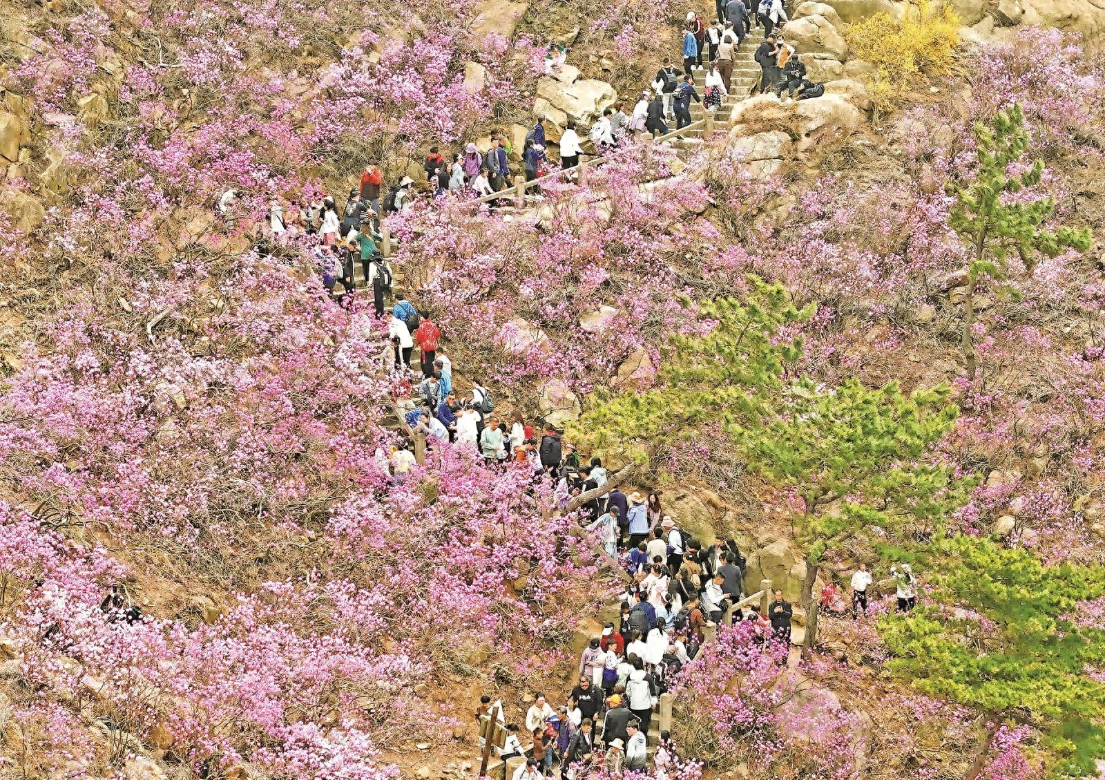 清明假期,山東青島大珠山景區的萬畝野生杜鵑正值盛花期。漫山遍野的杜鵑吸引衆多遊客前往賞花遊玩,享受春光。張進剛 攝