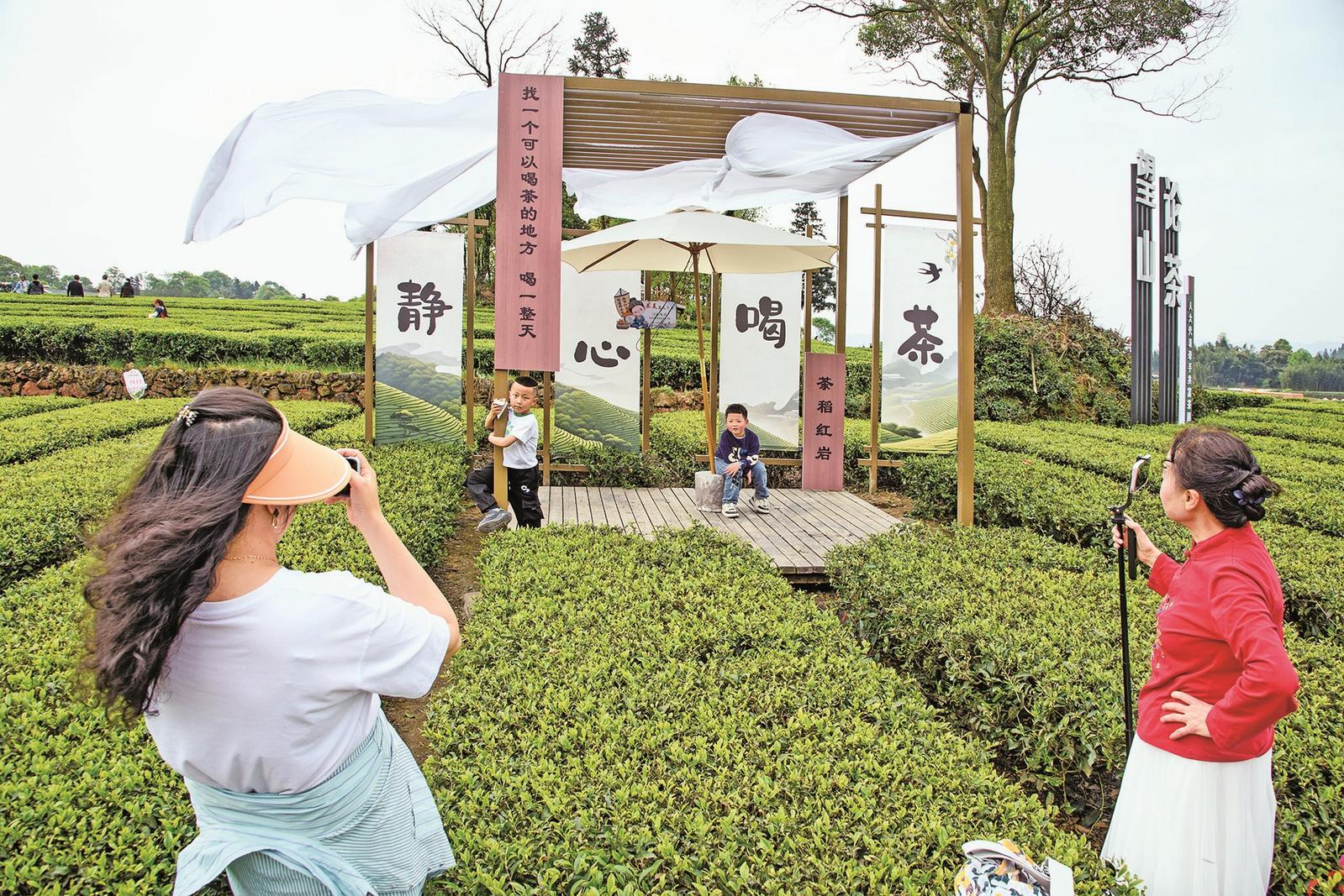 四川省敘永縣日前推出第二屆“丹山慢生活”茶旅文化體驗活動。本次活動以“品茶紅巖村 悟道丹山裏”爲主題,吸引衆多茶文化愛好者踏青賞春,採茶品茶。圖爲遊客在敘永縣敘永鎮紅巖村茶園打卡拍照。 顏林 攝