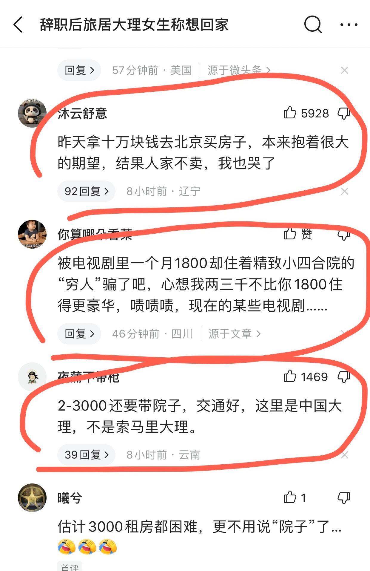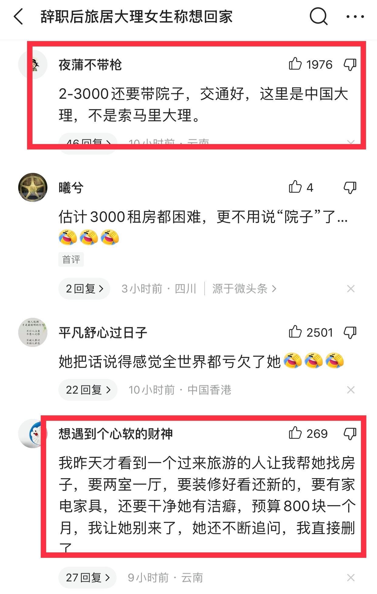 理想很豐滿、現實很骨感,最近有一對湖南長沙98年的小情侶,裸辭之後到雲南大理旅居,根據這對小情侶2024年4月7號發佈的視頻,女生吐槽預算3000元在大理租一個自己喜歡院子,只要交通方便一點,不要太偏就好,他們來到大理先找了一個民宿暫住幾天,租啦一輛電動車,古城周邊村子四處走訪,發現2000元至3000多元根本租不到院子,現實中網上那種圖片效果,需要七八千一個月,女生說跟宣傳的不一樣,感受大理文化也沒有感受到,提起找房的經歷,就想哭,一邊流淚,一邊說,現在很後悔,就想回長沙。