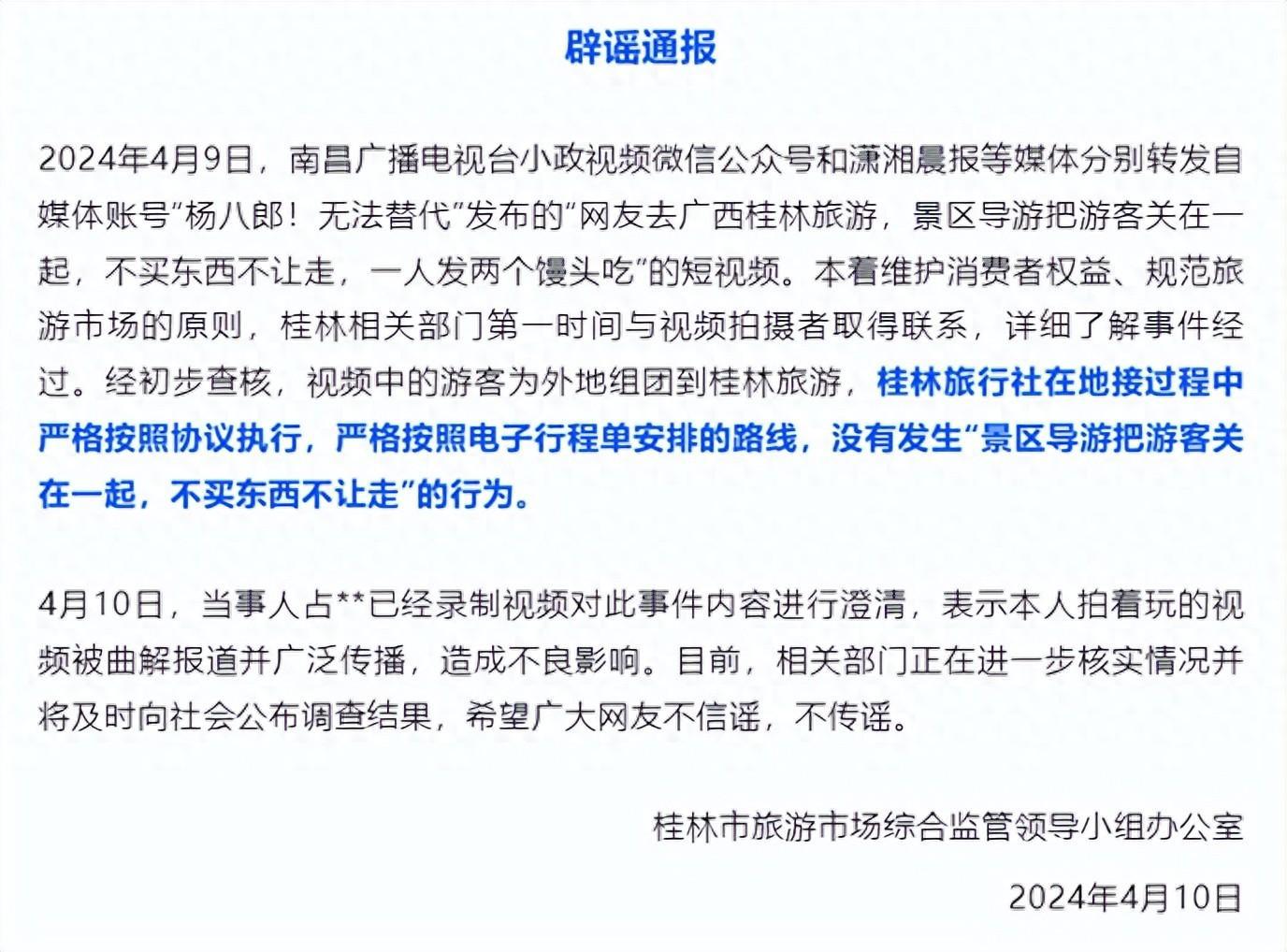 今天(4月10日),廣西桂林市旅遊市場綜合監管領導小組辦公室發佈通報稱,近日,部分媒體轉發了某新媒體賬號發佈的“網友去廣西桂林旅遊,景區導遊把遊客關在一起,不買東西不讓走,一人發兩個饅頭喫”的短視頻。本着維護消費者權益、規範旅遊市場的原則,桂林相關部門第一時間與視頻拍攝者取得聯繫,詳細瞭解事件經過。