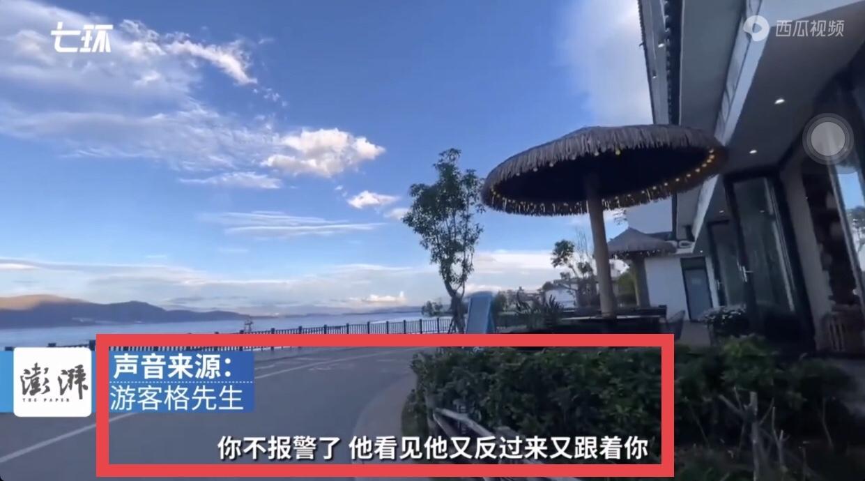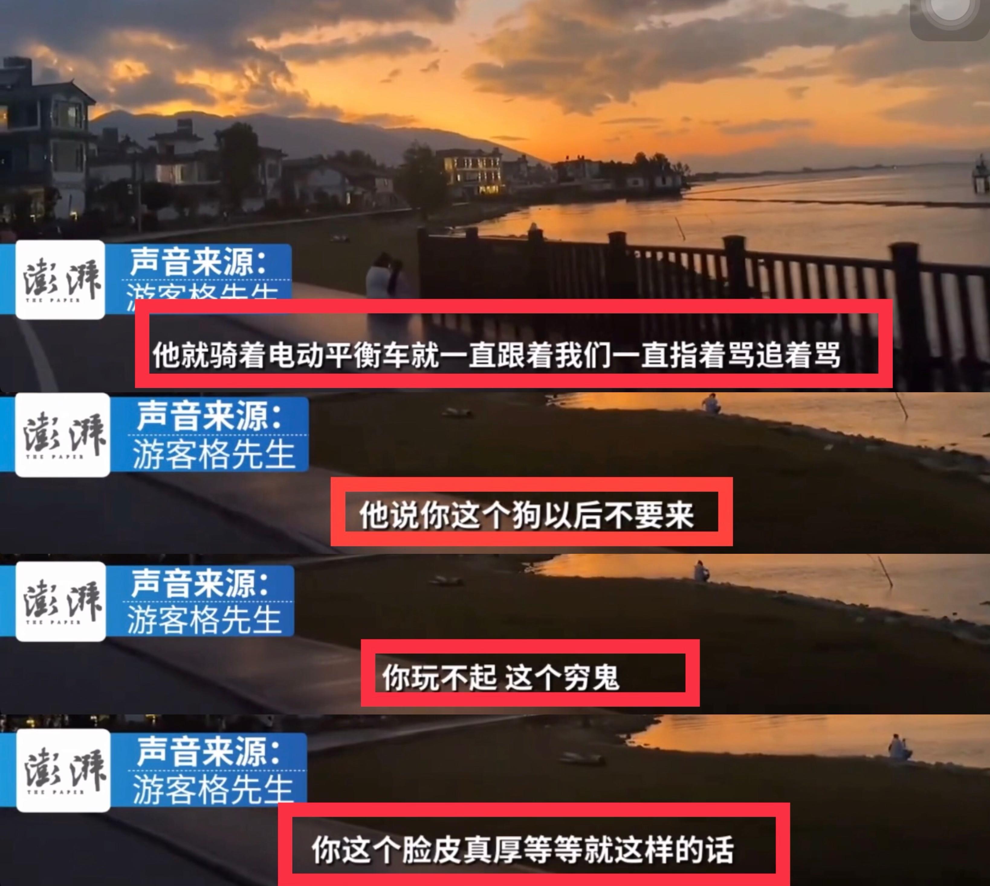 隨後事態升級,那位酒店員工騎着平衡車,一直追着他們騷擾他們、罵他們說你這種狗,窮鬼,臉皮那麼厚,以後不要來大理旅遊了?遊客格先生一行聽到這些侮辱性的話真是難受悲傷,出來旅遊遇到這些不開心事情,誰也受不了,最後逼得格先生只能報警,每報警一次,這位酒店員工罵人的行爲就收斂一點,一直報警五六次,大理警方介入,文旅部門介入,纔算平息這個事情,對酒店和員工進行了批評教育,酒店也給遊客道歉了。