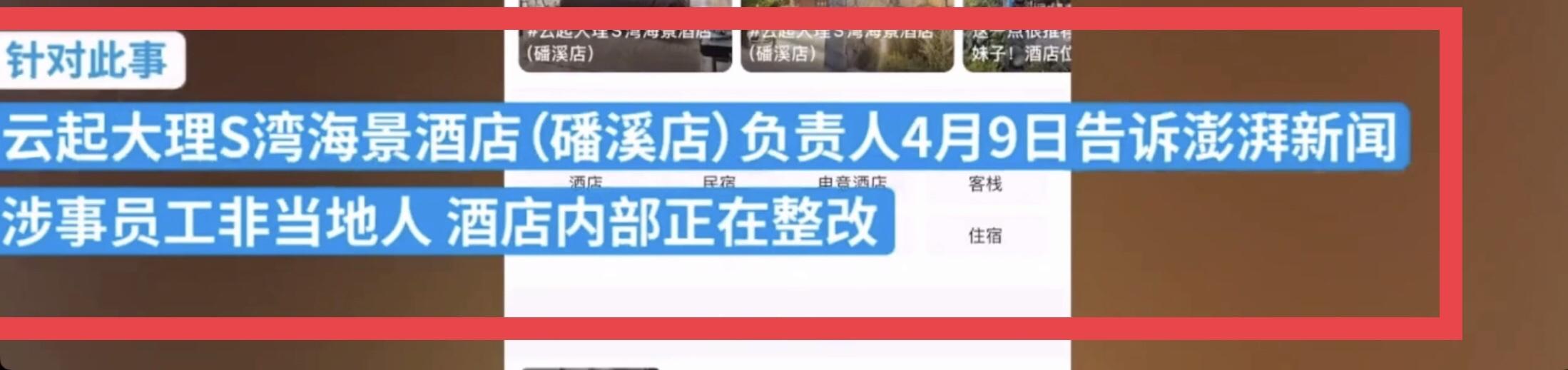 目前雲起大理s灣山景酒店(磻溪店)負責人表示,當前店鋪對涉事店鋪員工停職處理,店鋪升級加強對員工服務素質培訓,他說這個事情肯定是我們員工做得不對,我們坦然接受整改,批評,認罪認罰。