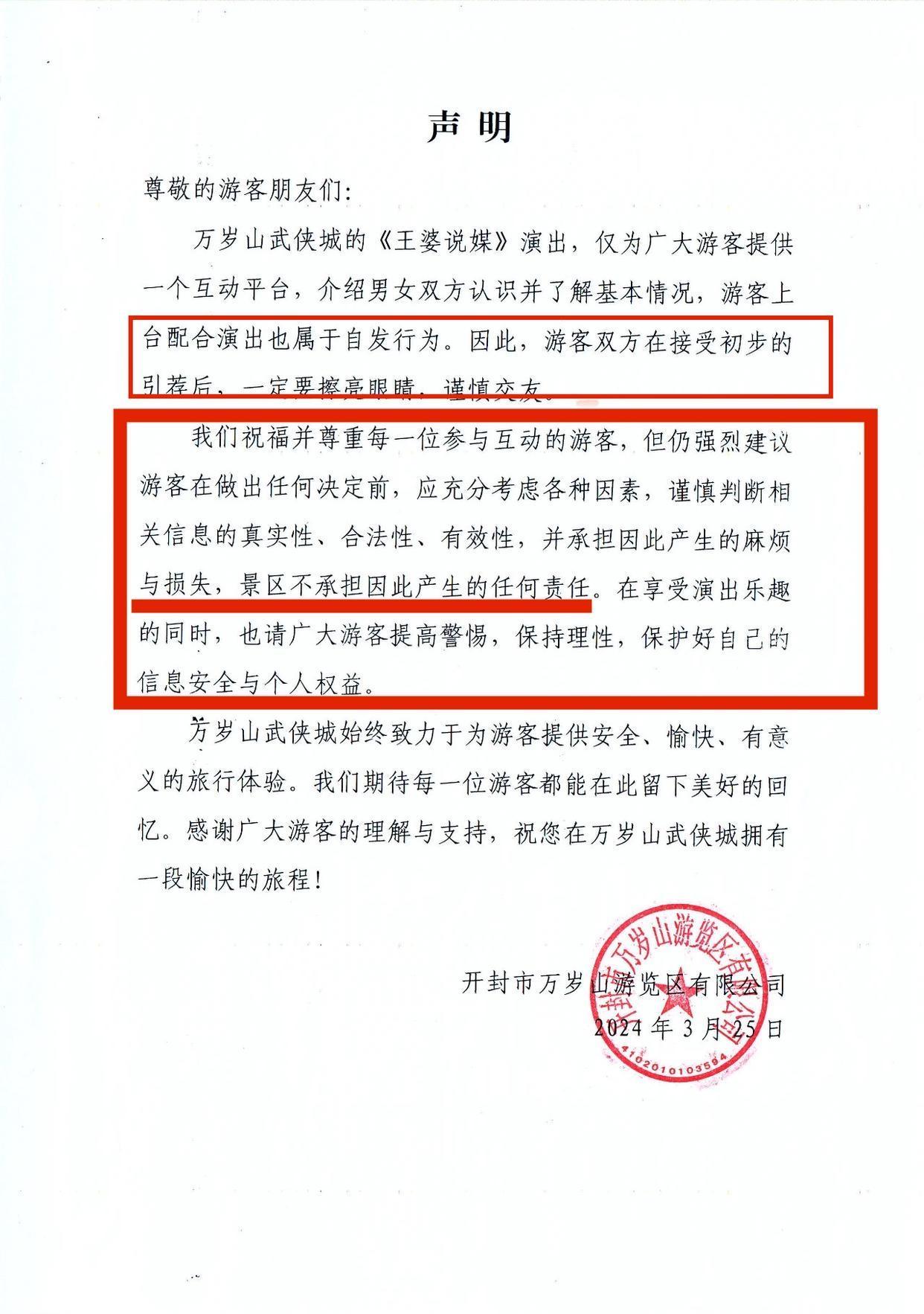 隨後媒體就報道王婆說媒幾個事情,鄭州已婚男子(劉凱)揹着自己老婆去相親,並且牽手成功四川女孩,如果不是已婚男子劉凱老婆自己曬出結婚證,說不定那個四川女孩被劉凱嚯嚯了,再就是有兩個幾百萬粉絲網紅以相親名義蹭流量,佔用真正相親人時間,王婆不止一次警告網紅,把時間留給需要的人,就讓原本接地氣沒有套路非誠勿擾變味了,景區在當時也怕出亂子,還發文要求遊客謹慎交友,出了事情景區不負責。