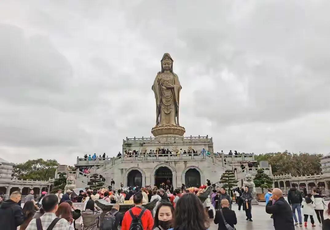 1、觀音像:1996年動工,1997年建成,著名佛造像大師劉大爲受妙善法師所託,爲普陀山南海觀音立像,總高33米,其中佛像高18米,蓮臺2米,佛教協會會長趙樸初先題詞,是普陀山景區地標建築,觀音像前是善男信女、遊客最爲朝拜祈福的地方,成爲普陀山遊客必須打卡景點。