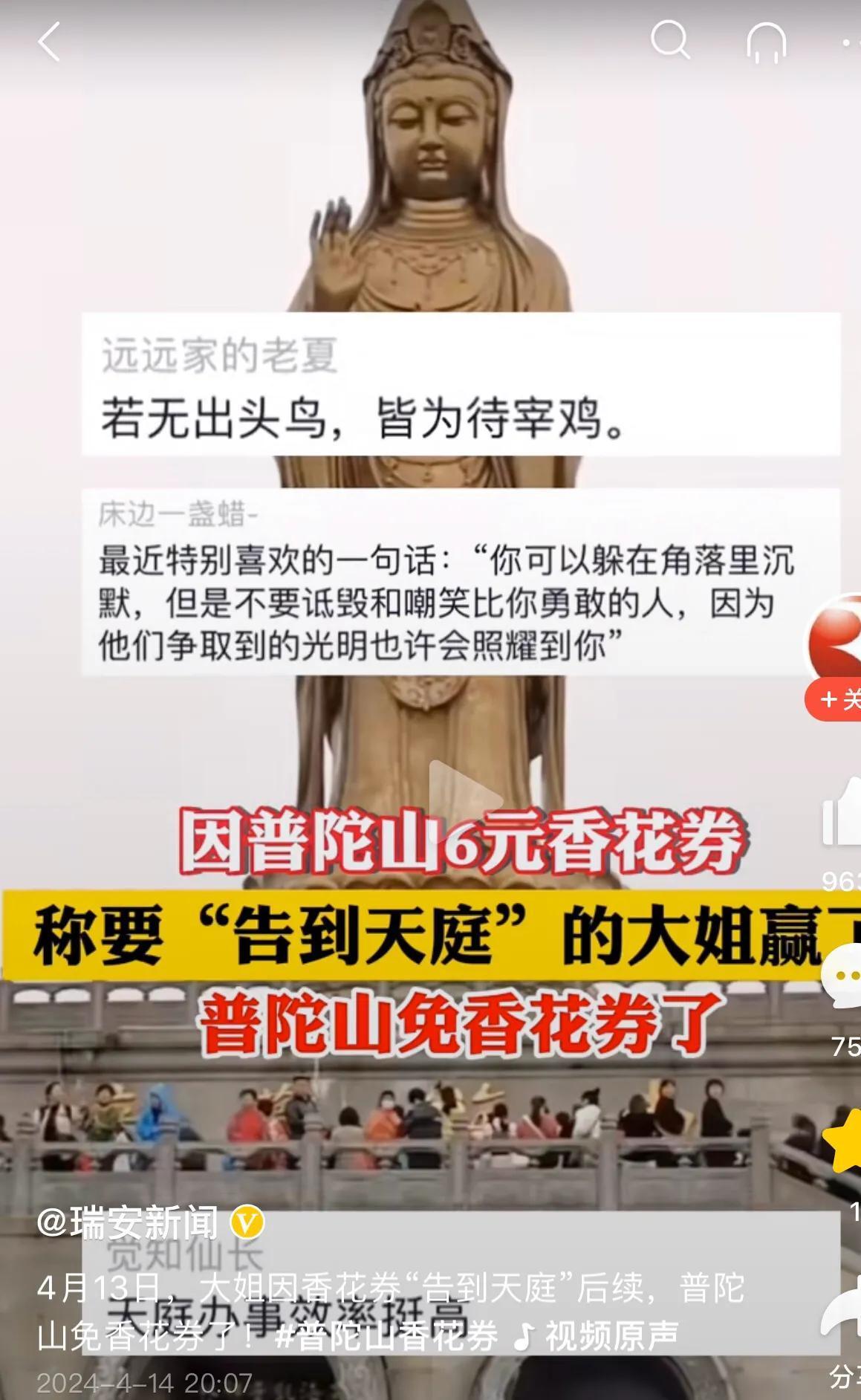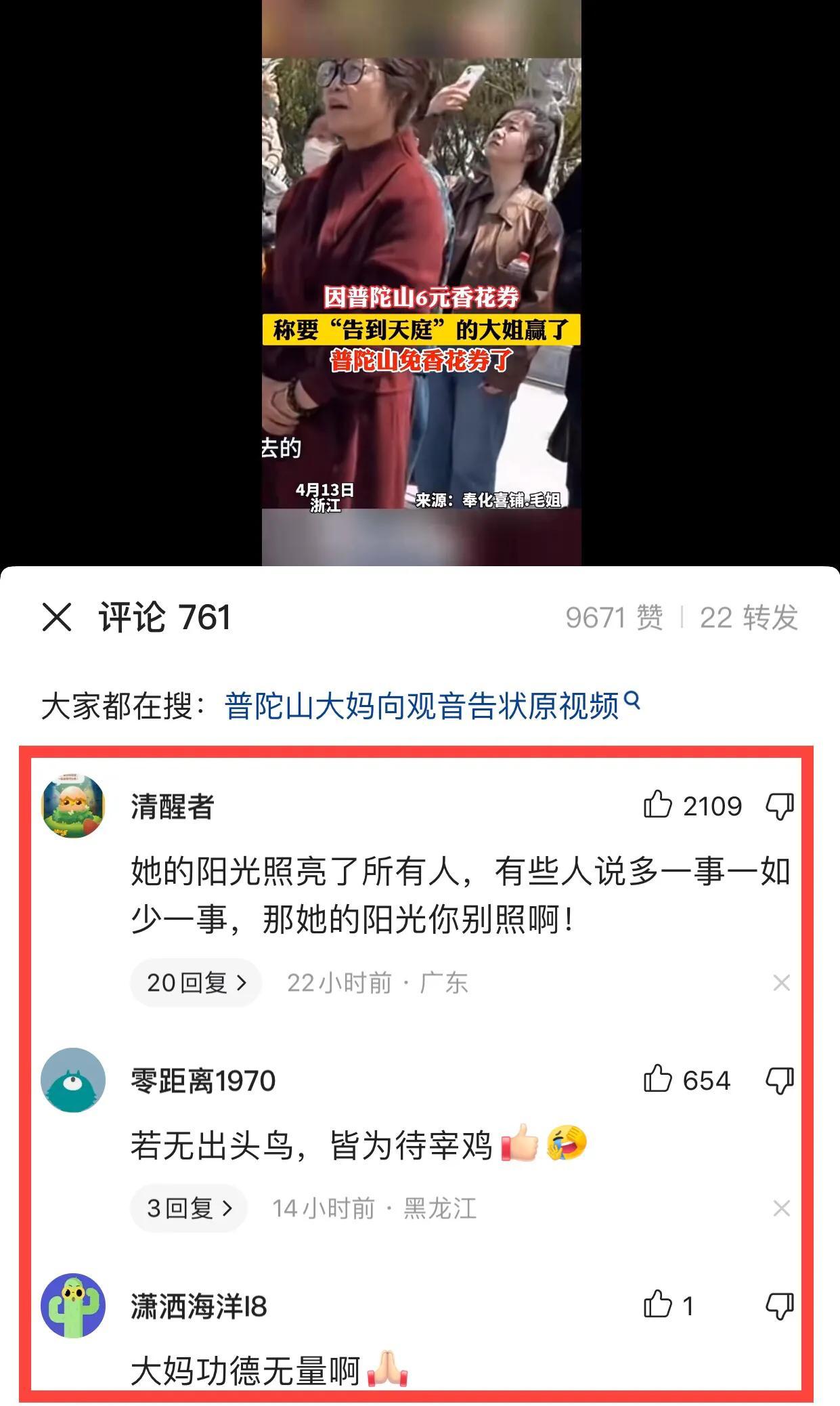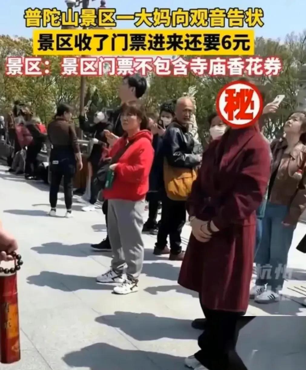 近期,一名女遊客在普陀山景區不滿額外收費,向觀音像表達不滿,並聲稱要將此事告到天庭去,她說大門票230元,全國遊客都沒有意見,爲啥觀音像前要另外多收6元,以前也沒有,這個錢到底是歸景區了還是歸政府了,景區要講清楚,女遊客站在觀音像前憤憤不平像佛祖喊冤,天管地管,我全部都要管,此視頻一出,衝上熱搜,受到廣泛關注。