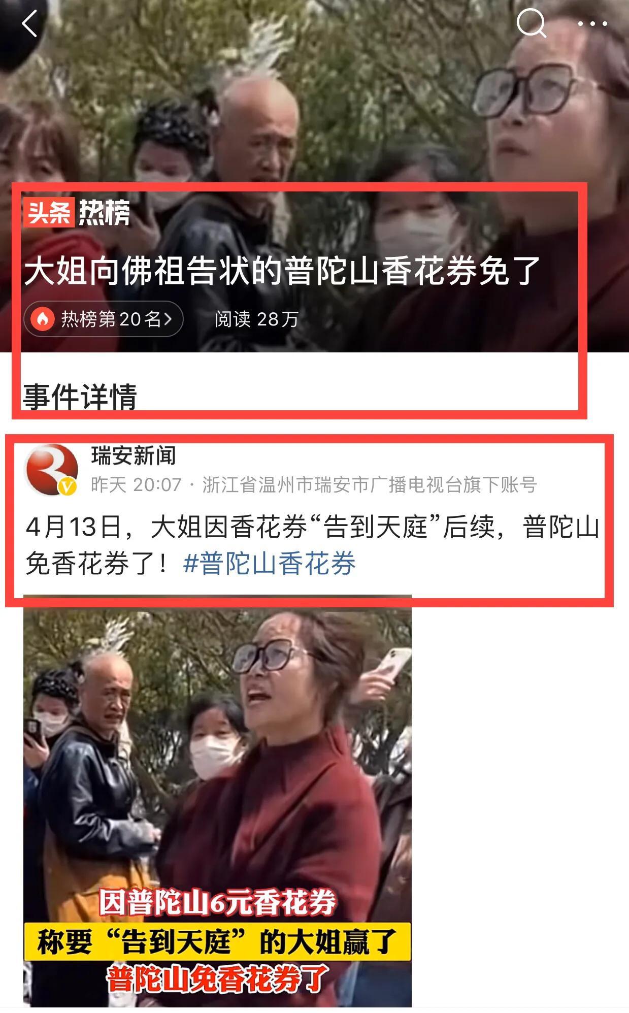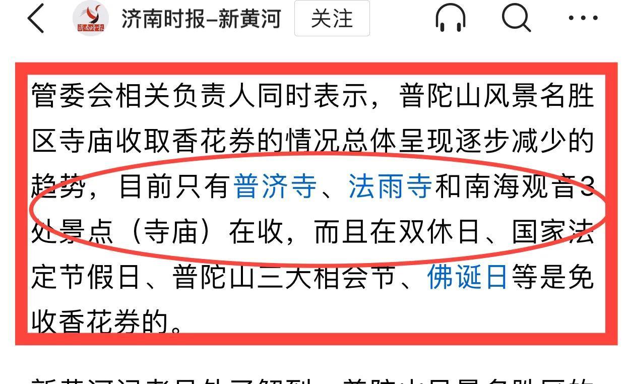 事情鬧得沸沸揚揚,4月15日關於普陀山景區香花捲免收的事情再次衝上熱榜,有媒體報道說普陀山經過大媽給天庭告狀,普陀山不在收取香花捲,而這一事情很快得到證實,景區工作人員回覆權威官方媒體《新黃河》說,(景區目前仍然會觀音像、法雨寺、普濟寺三個地方在收香花捲),但是逐年在減少,目前全部免香花捲說法不實,免香花捲爲國家法定節假日、週末,普陀山三大相會節、佛誕日均免收香花捲。