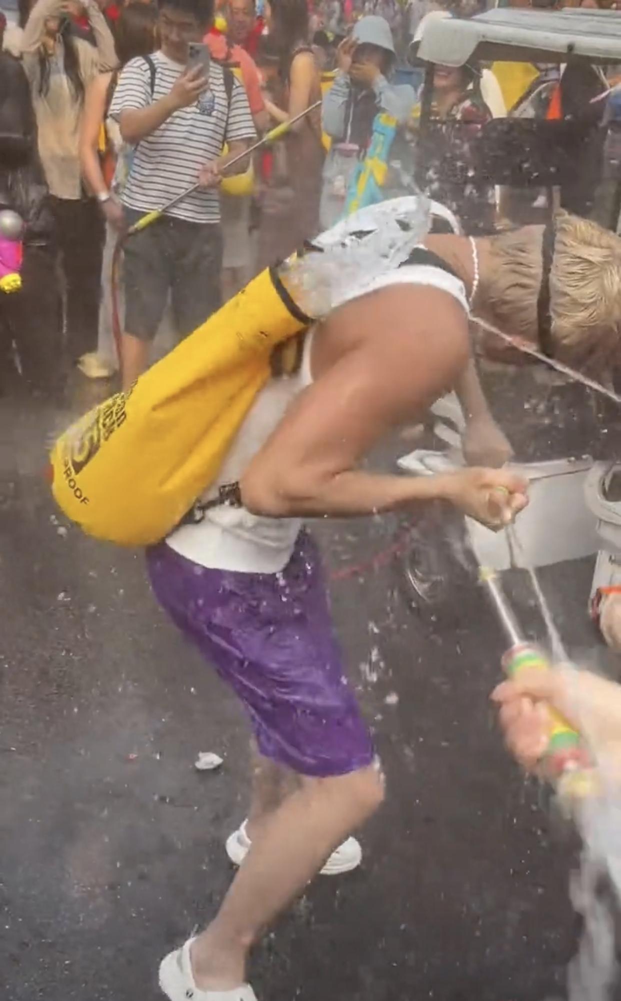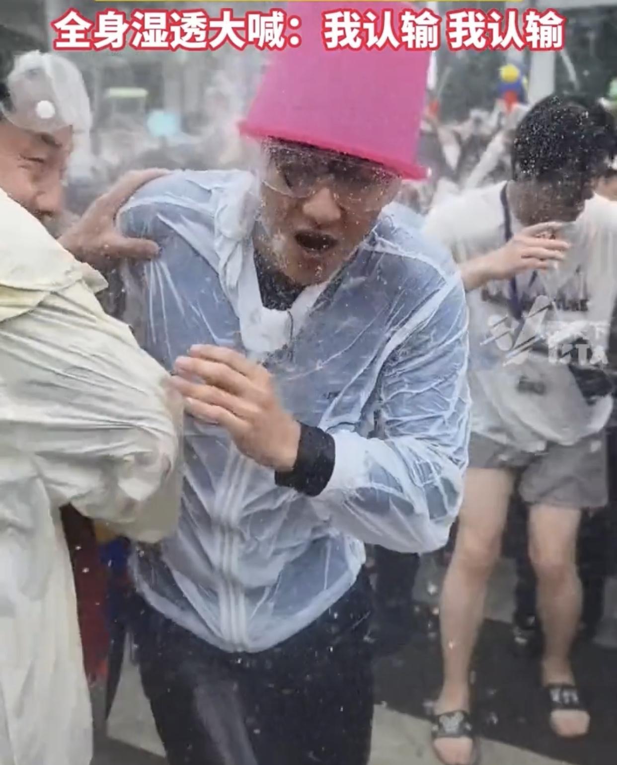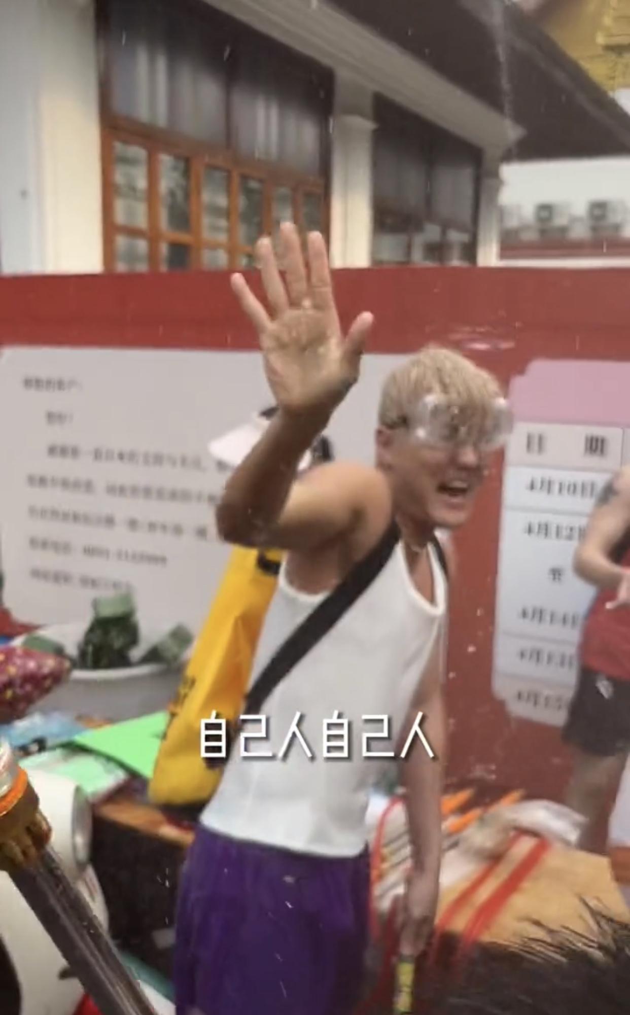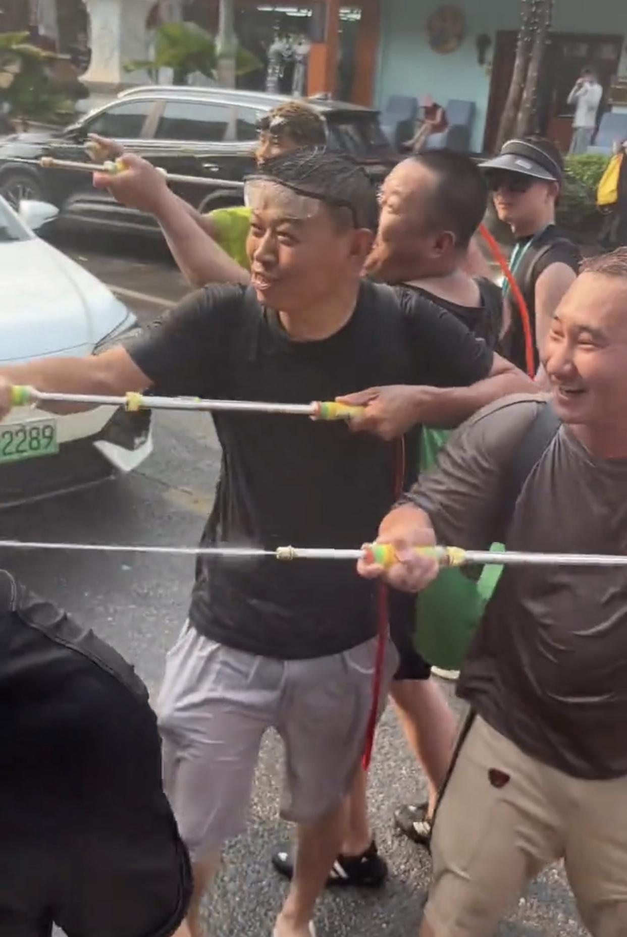 2、再說吳克羣,上場時候情緒非常高漲,態度囂張,揹着一個大噴霧器,他準備大戰遊客,還沒等他反應過來剛加入潑水陣營就認慫了,一桶水根本潑不出去,周邊遊客蜂擁而上,只能四處躲閃讓遊客捉弄,大家就是要對他逗樂,大家拿出手機跟他合影拍照,他本人也非常開心,臉色洋溢着幸福的笑容,任何人沒有參加過潑水節都不能說大話,否則都敗下陣來。