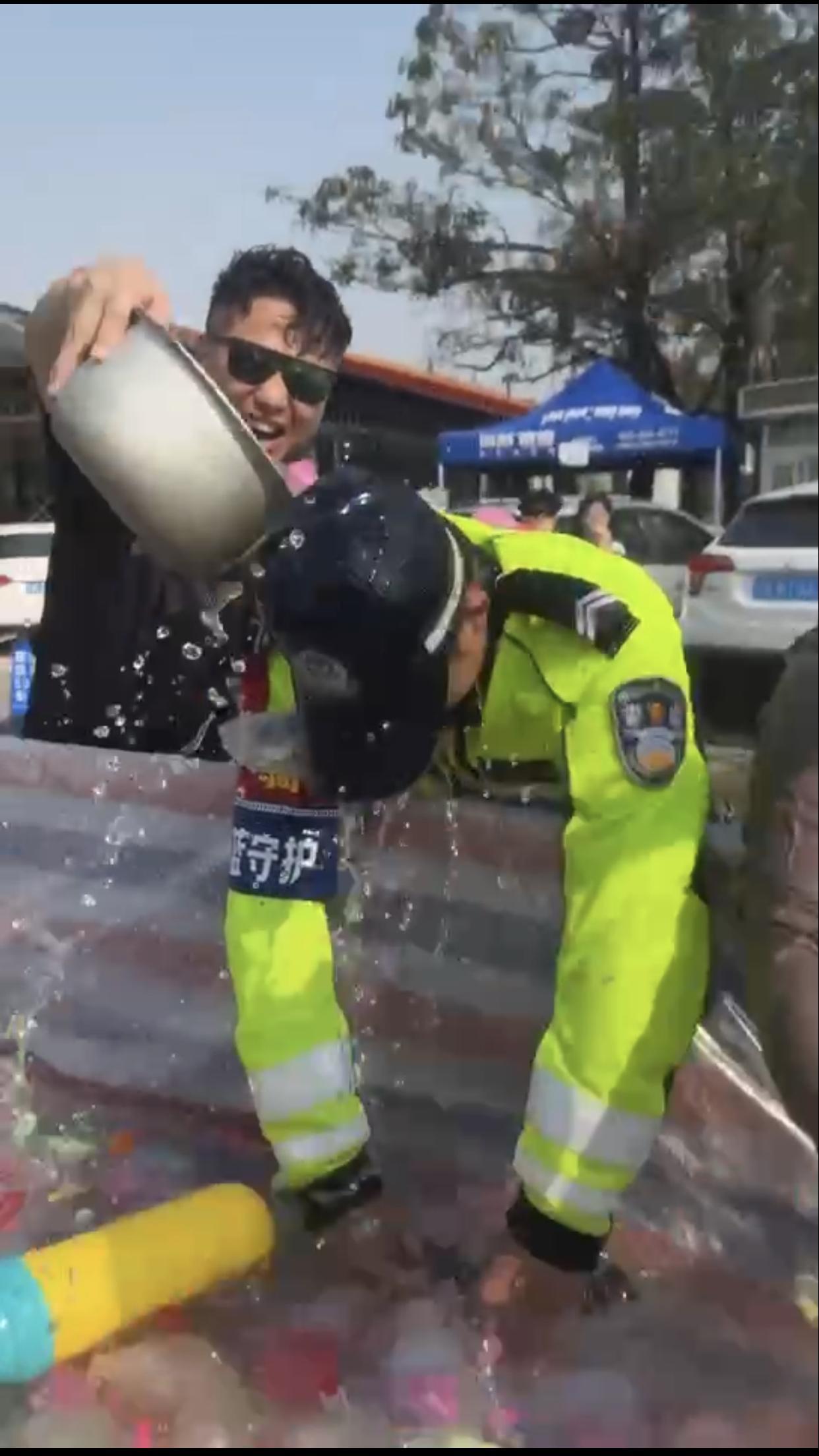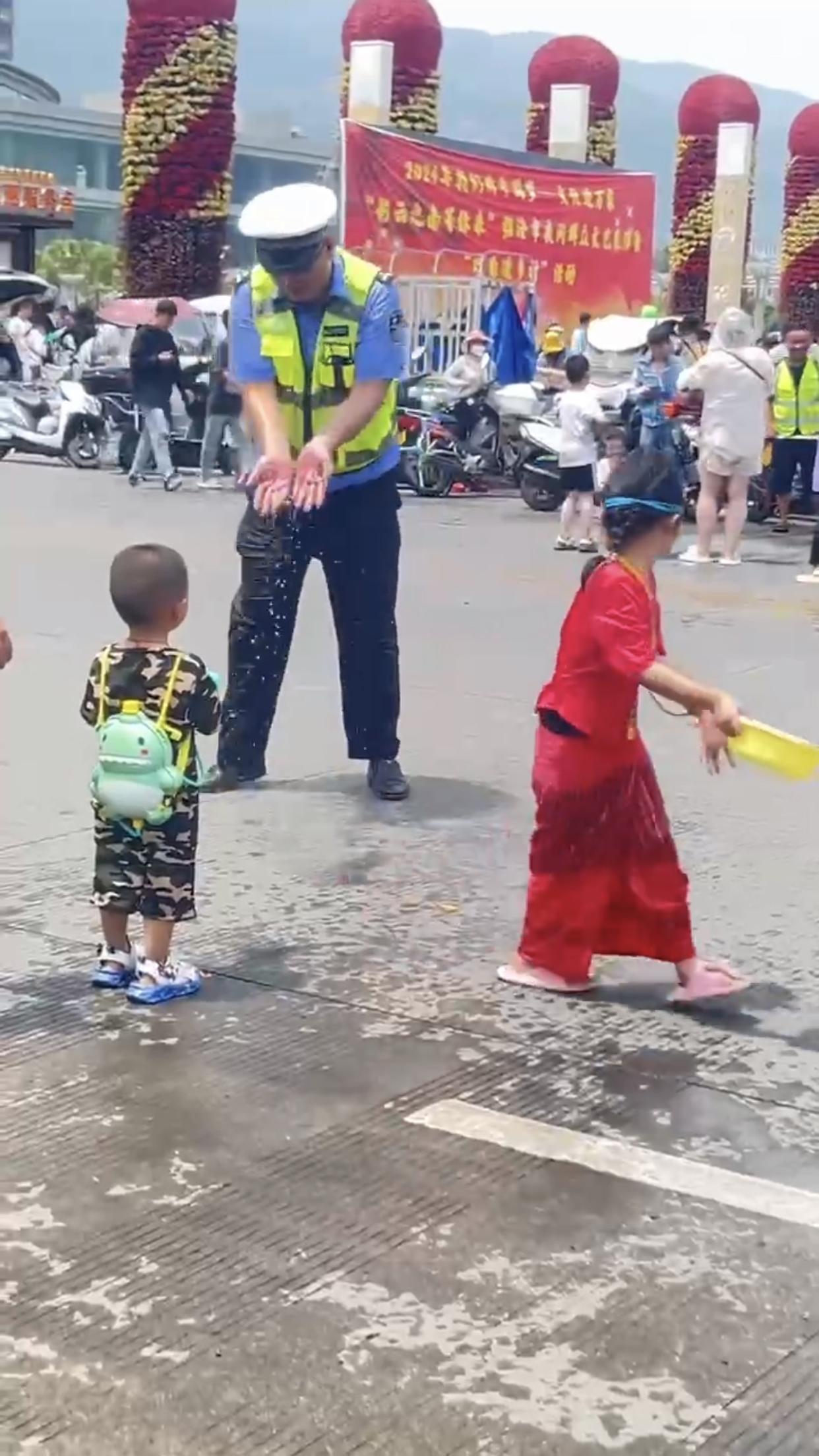 看到有三五歲小孩子在路邊看到交警叔叔,小孩子們特意走過去對着交警叔叔們潑水,交警叔叔們很配合小朋友們玩樂開心。