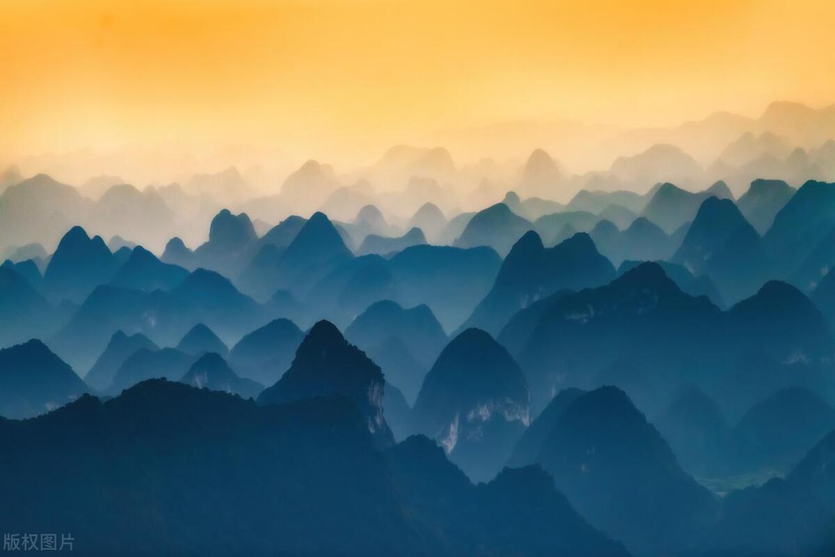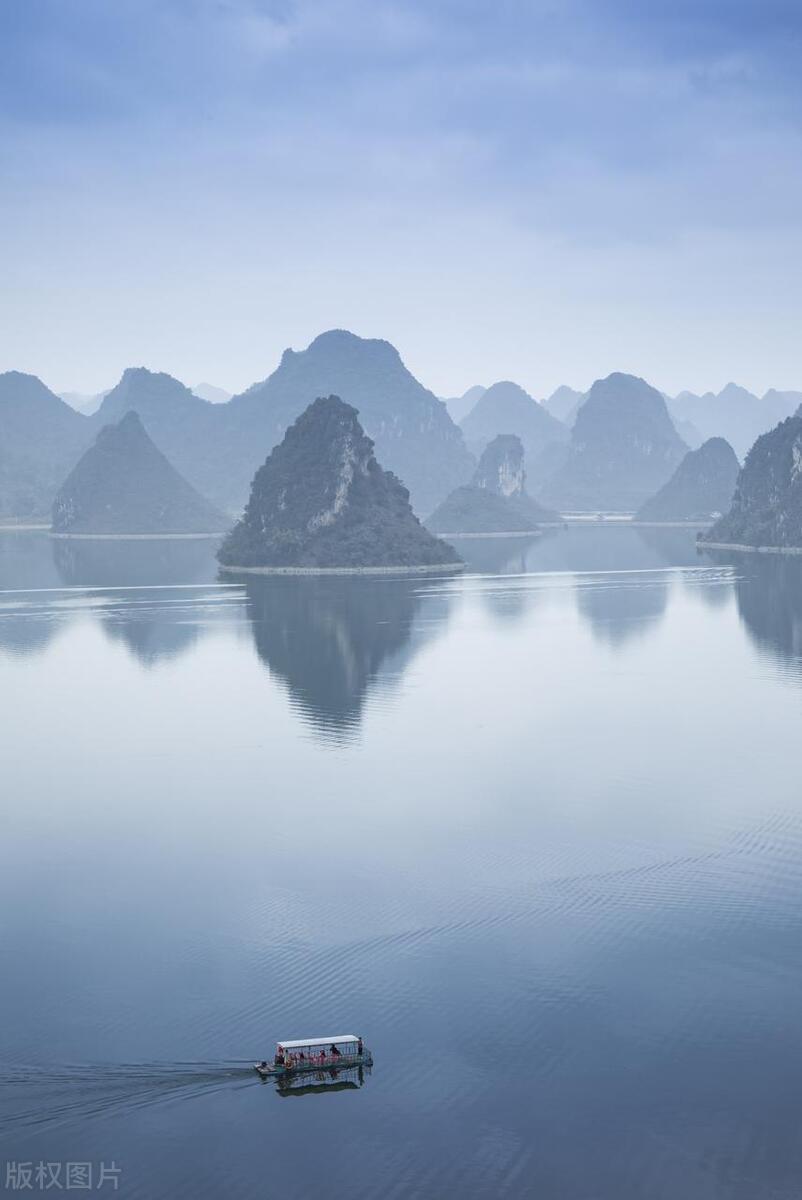 這是一個大型的喀斯特高原湖泊水庫,水中十幾座獨峯錯落突兀,在破曉黃昏時,水面如紙,霞光如筆,肆意揮毫,留下了一個個柔美詩意的畫面,窮盡了外國人對中國山水的所有想象。