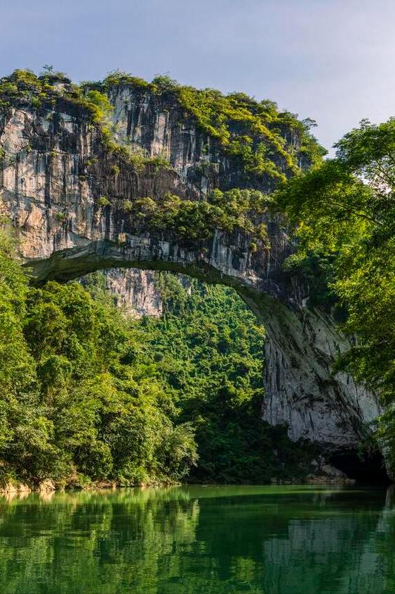 這是一條由三座大山塌陷而成的天然石拱橋,被專家稱爲世界上最大、最美的水上天生橋。綠植附着其上,彷彿與山野融爲一體,渾然天成。