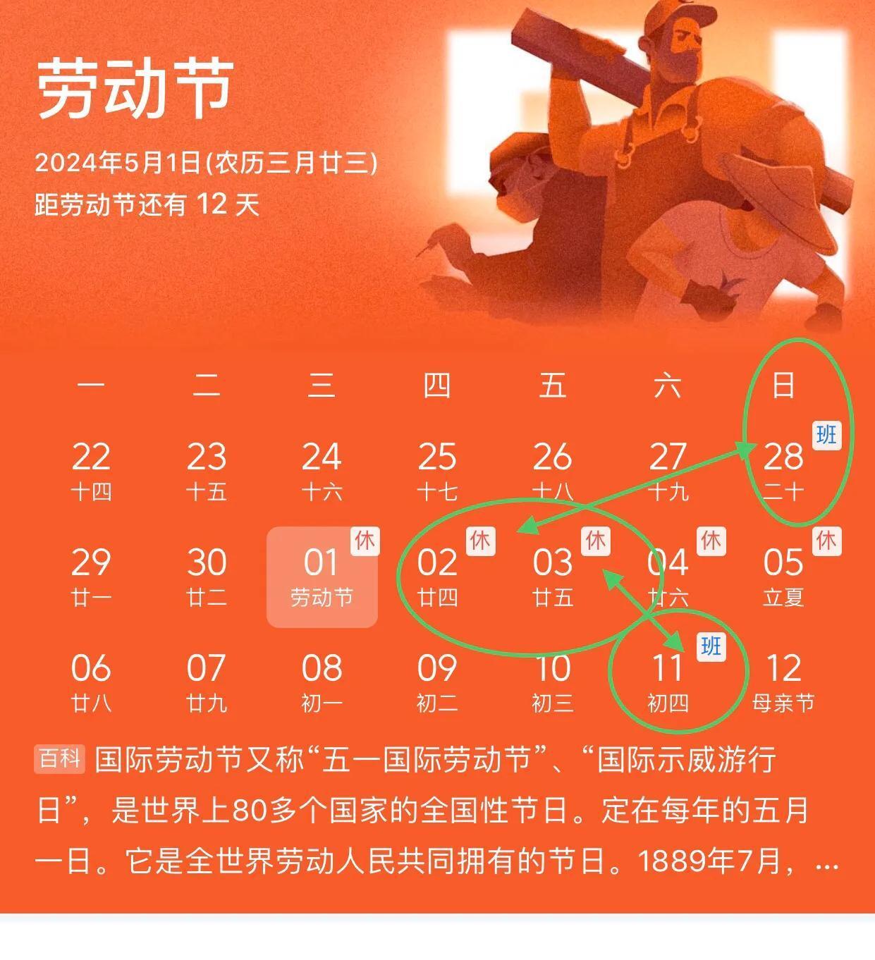 今年五一假期放假五天,5月1日至5月5日,4月28日恰逢星期日,安排補班,這個班就是補5月2日(星期四的班),5月3日(星期五),這個班就用放假回來後,第一個星期六補班(也就是5月11日),5月4日至5月5日(恰逢週末兩天),這麼一算下來,補班兩天,加上週末該休息的兩天,一共四天,其實五一假期就只放了(5月1日)一天,看到這種表面上長假五天,實際上就是補班不出來的。