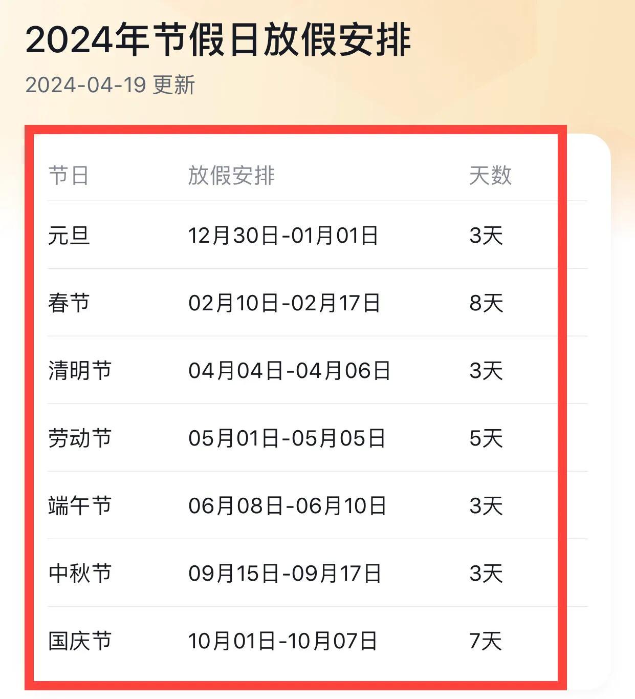 細數一下2024年,全年假期一共有32天,元旦三天,春節八天,清明三天,五一五天,端午三天,中秋三天,國慶節七天,面對數字上光鮮亮麗32天假期,實則法定假日只有11天,多於的21天,不是補班就是週末湊出來的,這十一天假日分別是:元旦節一天,春節三天,清明節一天,五一勞動節一天,端午節一天,中秋一天,國慶節三天。