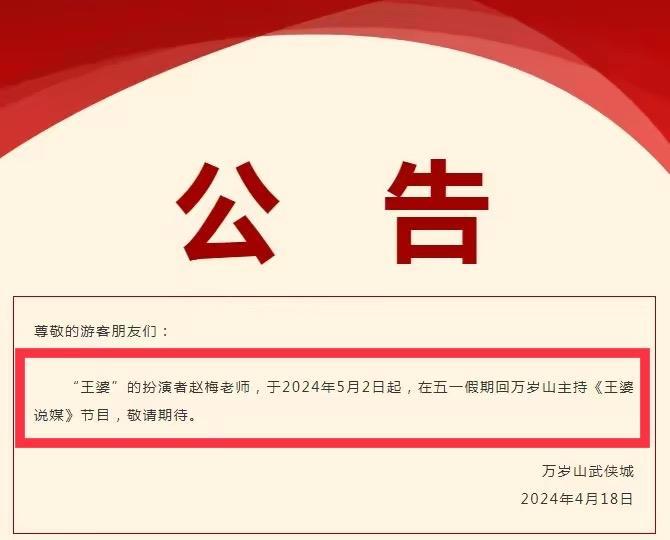 然而被網友質疑,多種猜測,4月18日,開封萬歲山武俠城景區緊急發文,說王婆5月2日迴歸說媒。這一通告也正好吻合王請假剛好一個月。王婆在葛仙村舞臺上也說了,希望五一假期各地朋友都去開封玩,瞭解開封大宋文化,品嚐開封美食,她在開封等大家。