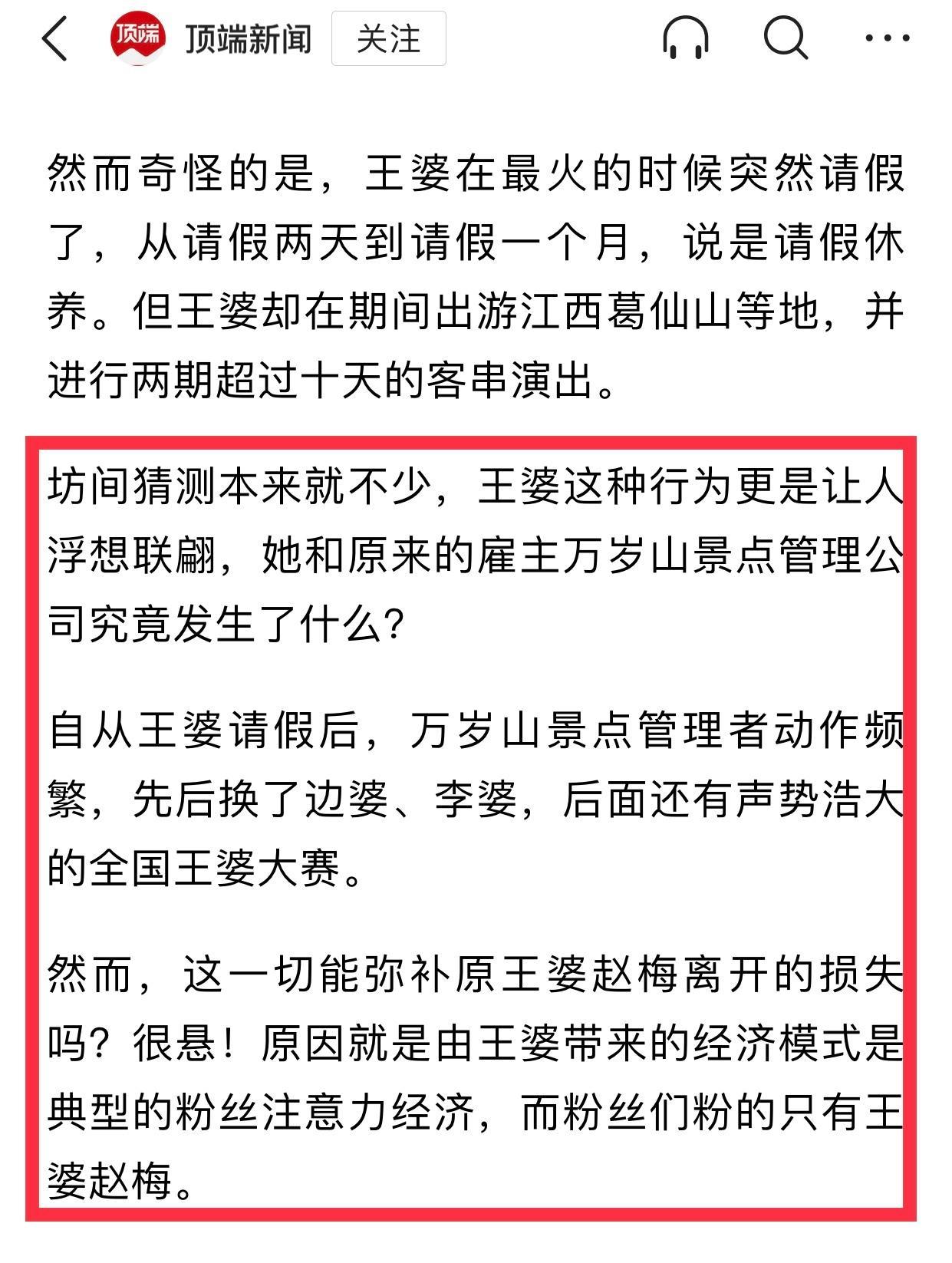 王婆休假一個月,萬歲山景區流量回歸到沒紅時候,王婆4月3日休假,4月13日就官宣接到江西上饒葛仙村景區邀請去說媒,王婆說最近剛好有空,想去散散心,聽說葛仙村風景仙境一般美,就跟家人商量答應葛仙村邀請,順便爲單身男女們辦點力所能及的事情。