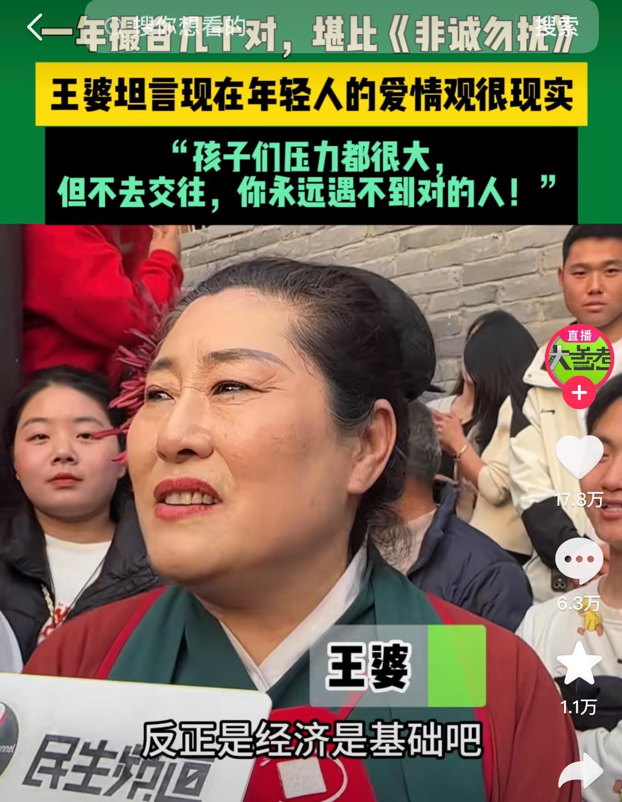 有心理學家研究發現,人類99%的人都想結婚,但是人類自己找到婚姻只能站30%的羣體,70%的羣體需要通過媒婆成全,網友喊話,開封這樣的王婆給年輕人來一打,有多少來多少,當下年輕人婚姻太需要王婆這樣的乾孃啦。