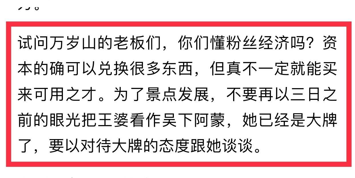 王婆暫時離場,萬歲山由李婆代替說媒,景區做了相親男女實名制登記,王婆走了,流量ip沒了,蹭流量主播煙消雲散,遊客銳減,幾乎與王婆在時候遊客少了三分之二不止。