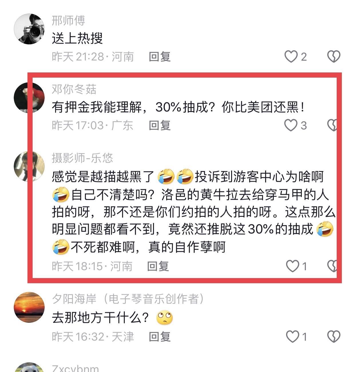 洛邑古城景區工作人員回覆:這個是正常辦理這個從官方約拍平臺攝影師,然後是需要交納這個保證金的。景區這邊爲了保障遊客的消費權益,然後因爲有些攝影師這一塊的話,是非專業的,或者是就是拍完、沒售後的情況下,那景區這邊遊客經常會投訴,保證金景區是要給遊客一個保障,但是這個誠信金正常的話,咱們攝影師不辦證的話,都是會退掉的,說景區掙提成,工作人員表示沒有接到通知說是抽30%提成。