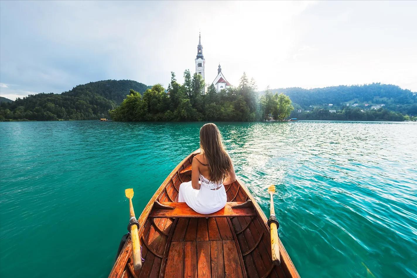 布萊德湖,位於斯洛文尼亞西北部,是由阿爾卑斯山冰川融化的雪水注入而成,湛藍清澈,風光旖旎,遺世獨立的聖母昇天教堂就靜靜地矗立於湖心小島上,優雅安靜,瀰漫了古老神祕的宗教氣息,猶如一處天堂勝境。