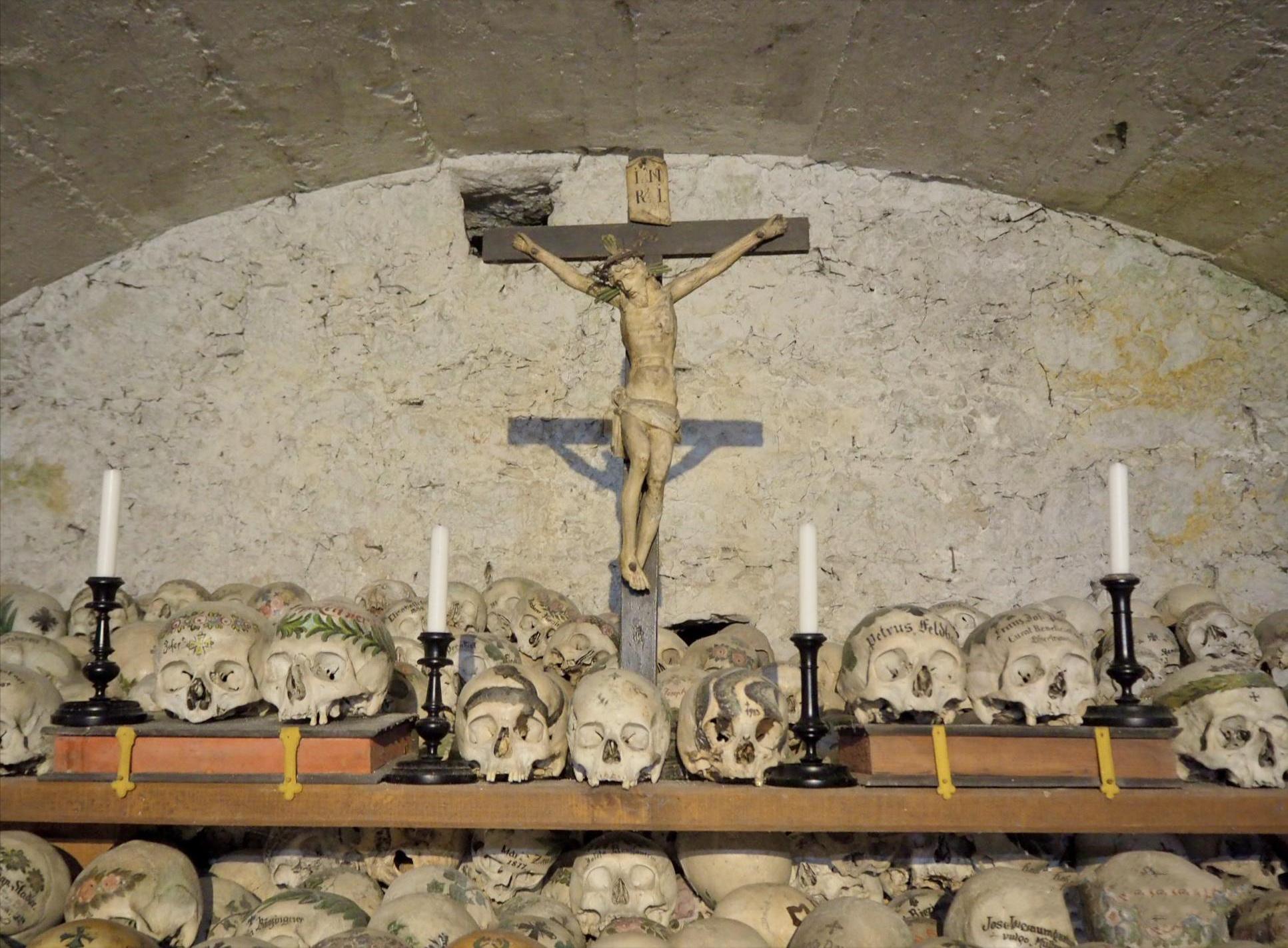 這座教堂邊上的人骨堂非常有名,裏面整齊地堆放着一排排骷髏頭,每個頭蓋骨上都有不同含義的彩繪紋樣和逝者的姓名,供人緬懷,這一習俗,已經沿襲了1600多年,體現了一種獨特的喪葬文化。