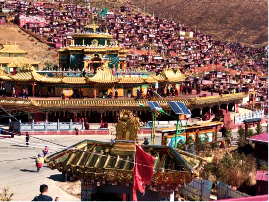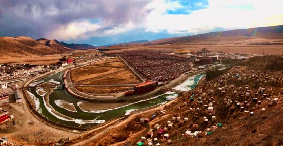 色達喇榮五明佛學院,位於四川省甘孜藏族自治州色達縣,在藏語中意爲“金色的馬匹”,是世界最大的藏傳佛學院之一,爲藏傳佛教寧瑪派(因喇嘛身穿紅色僧袍而俗稱紅教)聖地。數以千計的小木屋密密麻麻如同蟻巢般佈滿山坡,爲數衆多的絳紅色小木屋,延綿起伏,蔚爲壯觀。