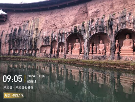 湖北恩施仙佛寺石窟雕鑿於酉水岸邊的紅山崖上,不僅是長江中游、兩湖地區僅存的唐代摩崖造像,同時也是現存規模最大的摩崖造像,其中通高6米的大型倚坐式彌勒佛像,在兩湖地區首屈一指,在國內也是較早、較大的實例之一。