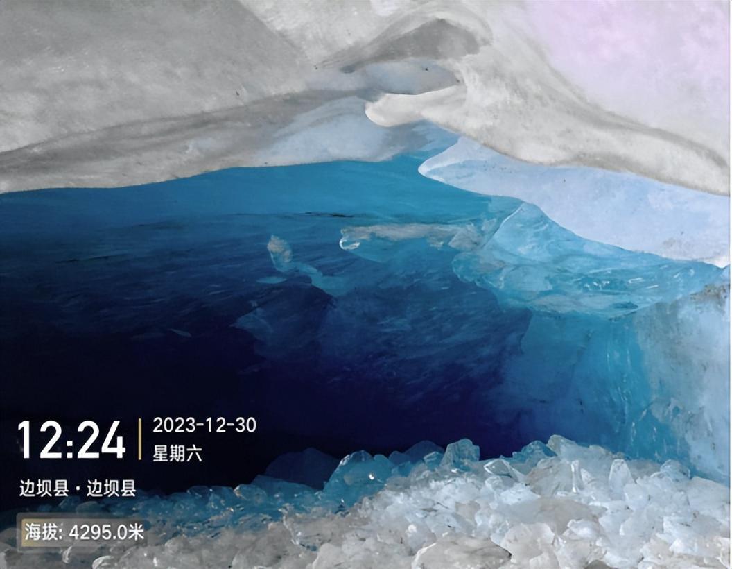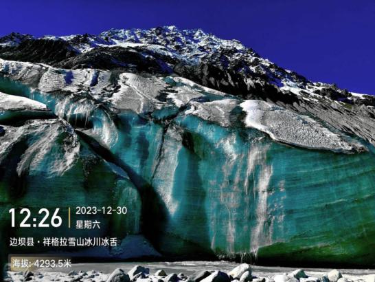 貢嘎藍冰洞位於西藏邊壩縣(本次行程最遠點)祥格拉雪山旁冰川冰舌的末端,2023年由當地一位村長在巡山時偶然發現。洞內呈弧拱型有地下暗河,四壁皆爲冰晶,猶如一顆顆晶瑩剔透、熠熠生輝的藍寶石。洞頂冰層呈現 “魚鱗” 狀,整個冰洞內部爲幽藍色,漫步其中就像走進了海底世界,在洞口陽光的照射下,猶如水晶宮殿般的美麗。藍冰洞也是本次行程中重要的目的地。天青色等煙雨,我在藍冰洞等你,我來過了,你來嗎?
