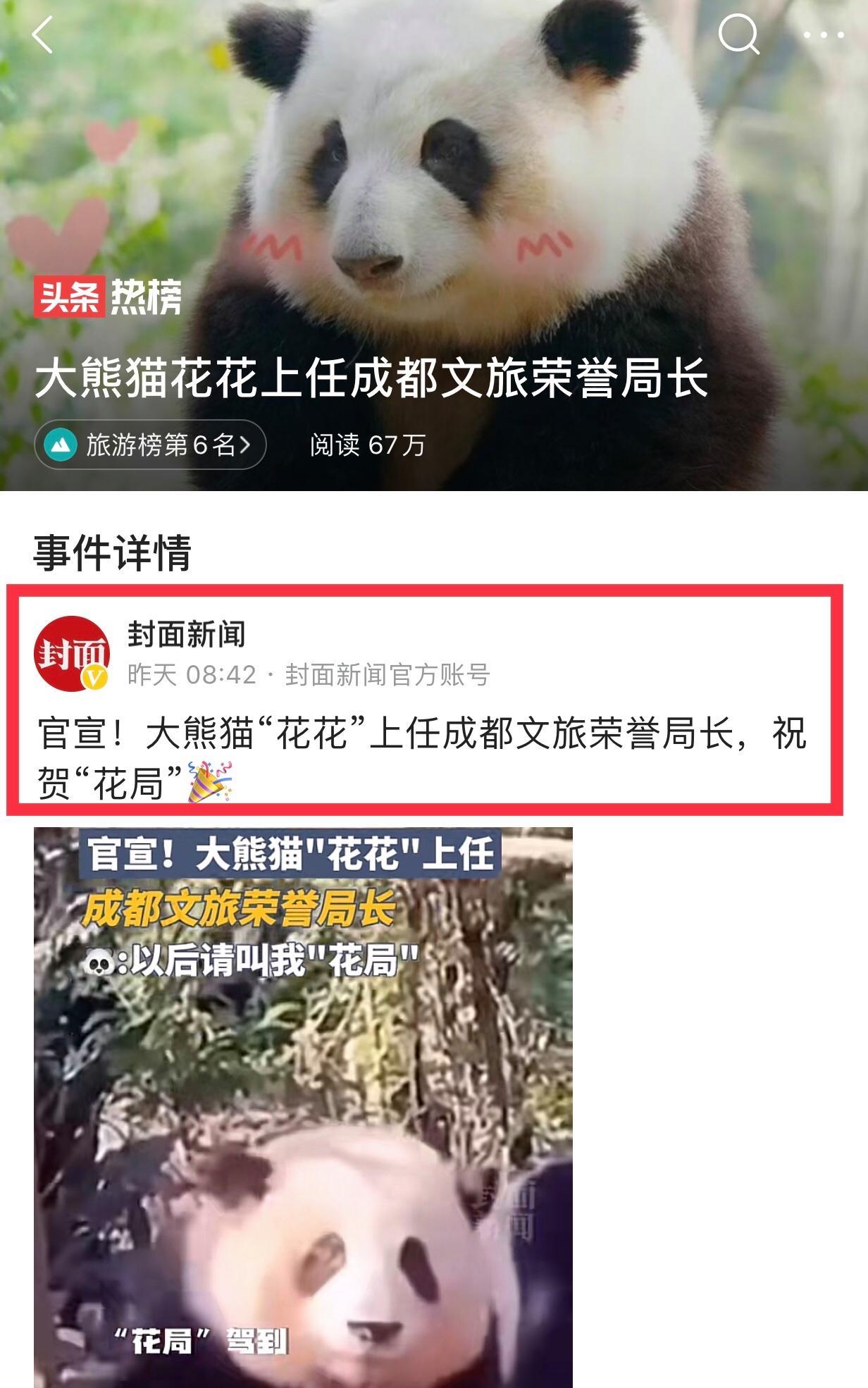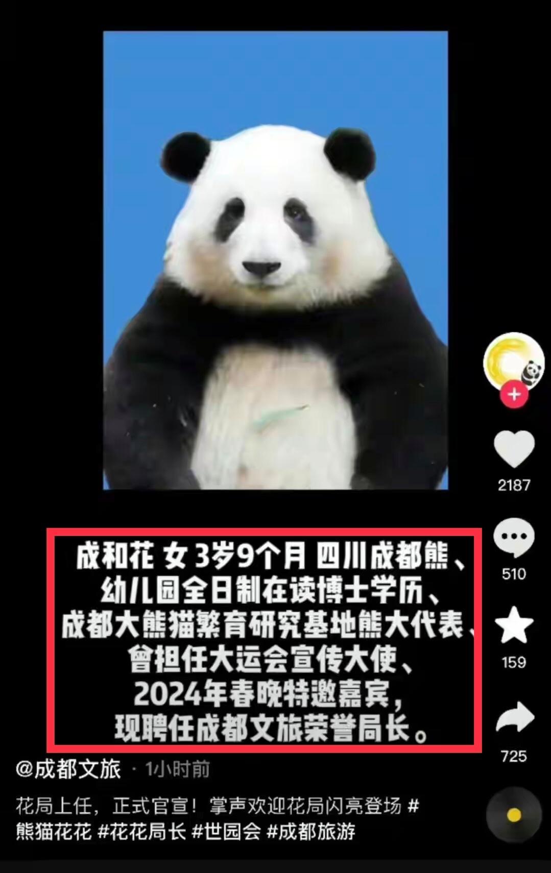 大熊貓花花擔任成都文旅局長,網友笑得合不攏嘴:全票支持花局
