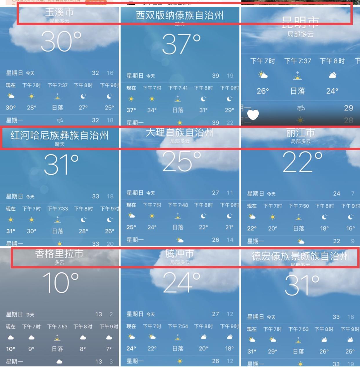 那麼筆者久居雲南,目前查詢了雲南全省旅遊城市天氣預報,(昆明、大理、麗江、西雙版納、玉溪、紅河哈尼族彝族自治州)等知名旅遊城市,在未來十五天幾乎無任何雨水天氣,基本是晴空萬里無雲,最佳旅遊時節,雲南此時旱季正接近尾聲,所以強力推薦推薦遊客有安排南方(江浙滬)廣東、湖南,湖北遊客,改簽到雲南旅遊吧,值得提醒到雲南旅遊的遊客,到西雙版納、德宏、這些地方短袖就夠了,如果前往大理、麗江、香格里拉則需要備好外套,早晚溫差較大。