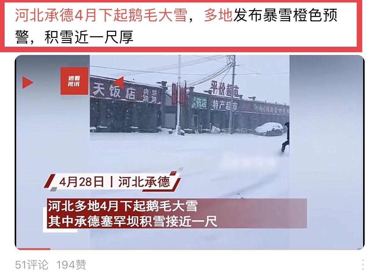 目前根據天氣預報信息,4月28日北方多個城市極速降溫,河北承德塞罕壩,多地下起鵝毛大雪,堪比寒冬臘月,內蒙古錫林郭勒多倫多縣普降大雪,學校安排臨時停課,這是北方天氣。
