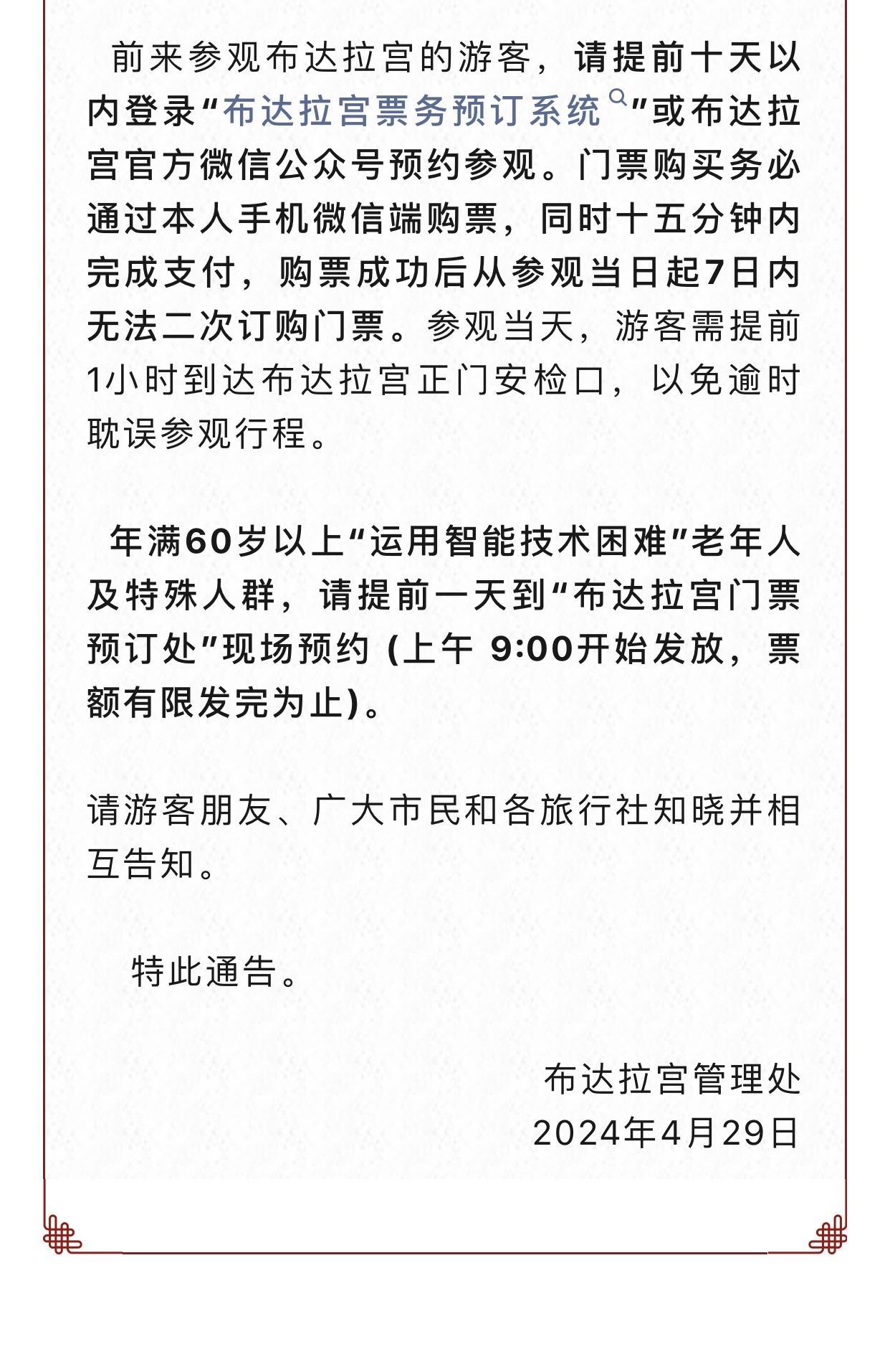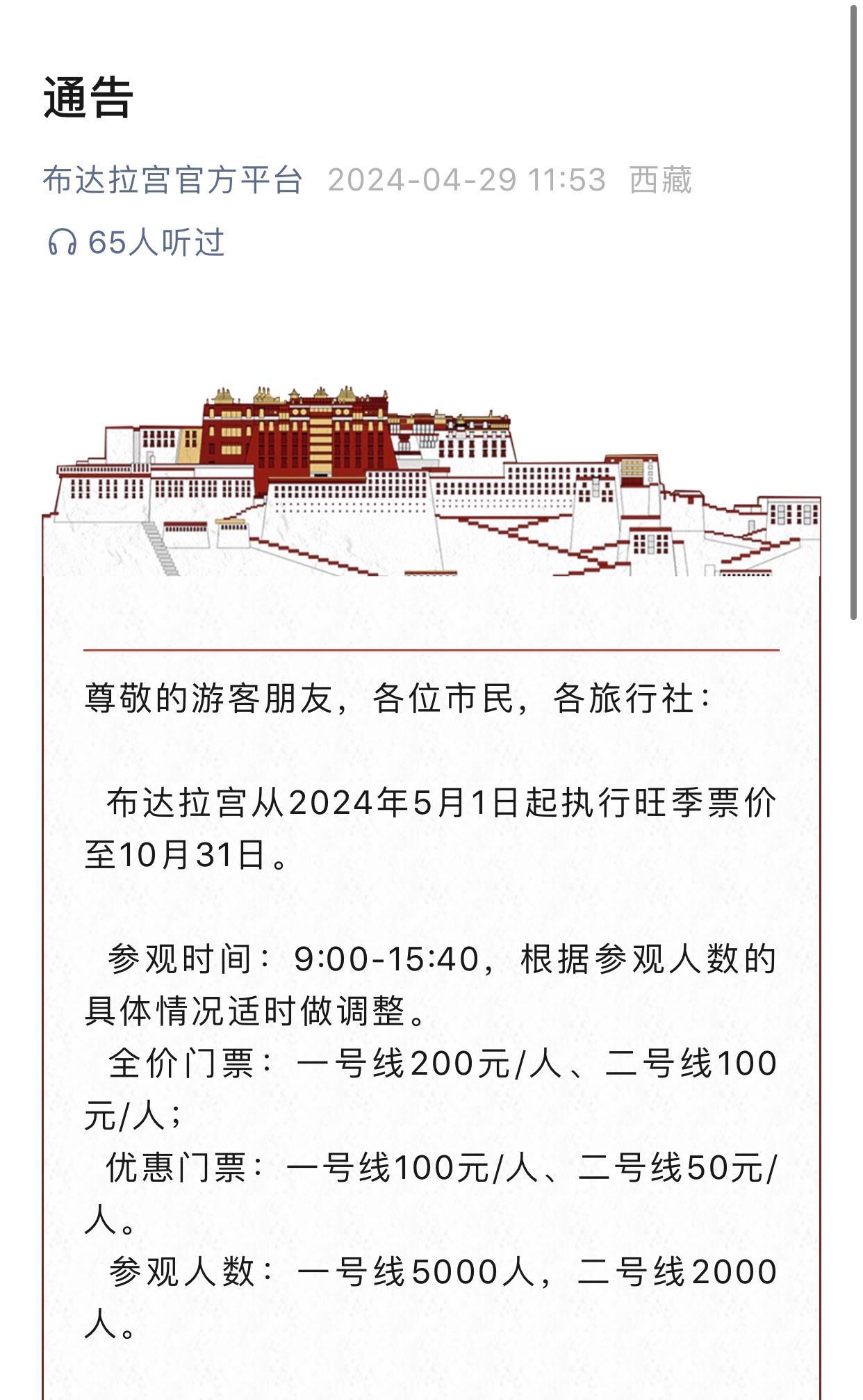 如今2024年五一黃金週到來,布達拉宮景區官方宣佈,宣佈淡季結束,從2024年5月1日起,執行旺季門票價格。