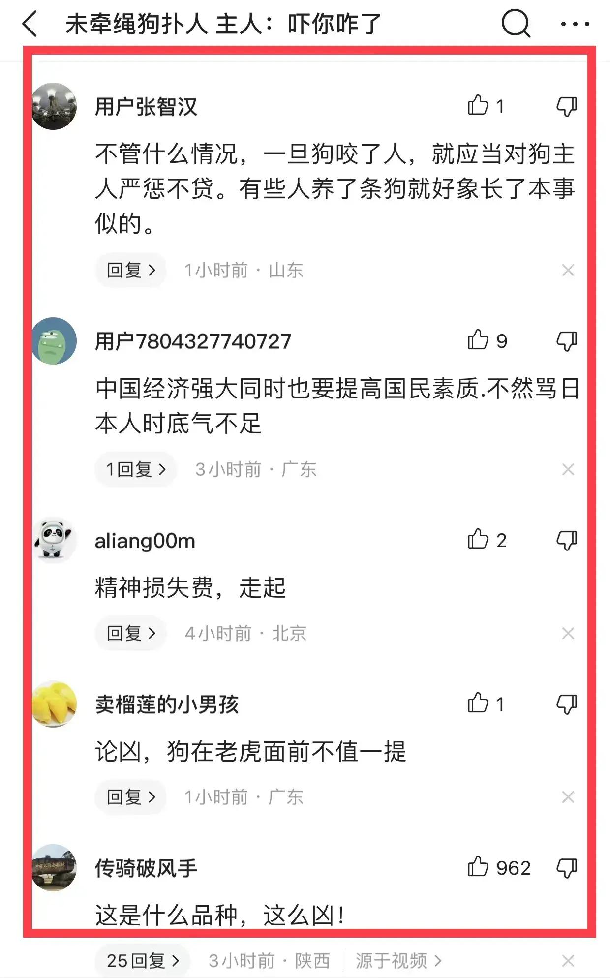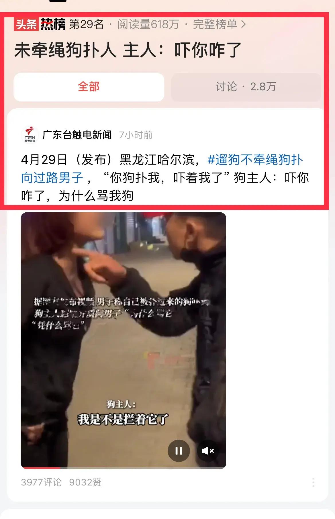 在4月29日黑龍江哈爾濱發生的這起事件中,一名女子遛狗時沒有牽狗繩,導致狗撲向過路男子。當男子因爲受到驚嚇而指責狗時,狗主人卻反問男子爲什麼要罵她的狗。狗主人反問男子“你爲什麼罵我狗”的行爲,更是讓人難以接受。