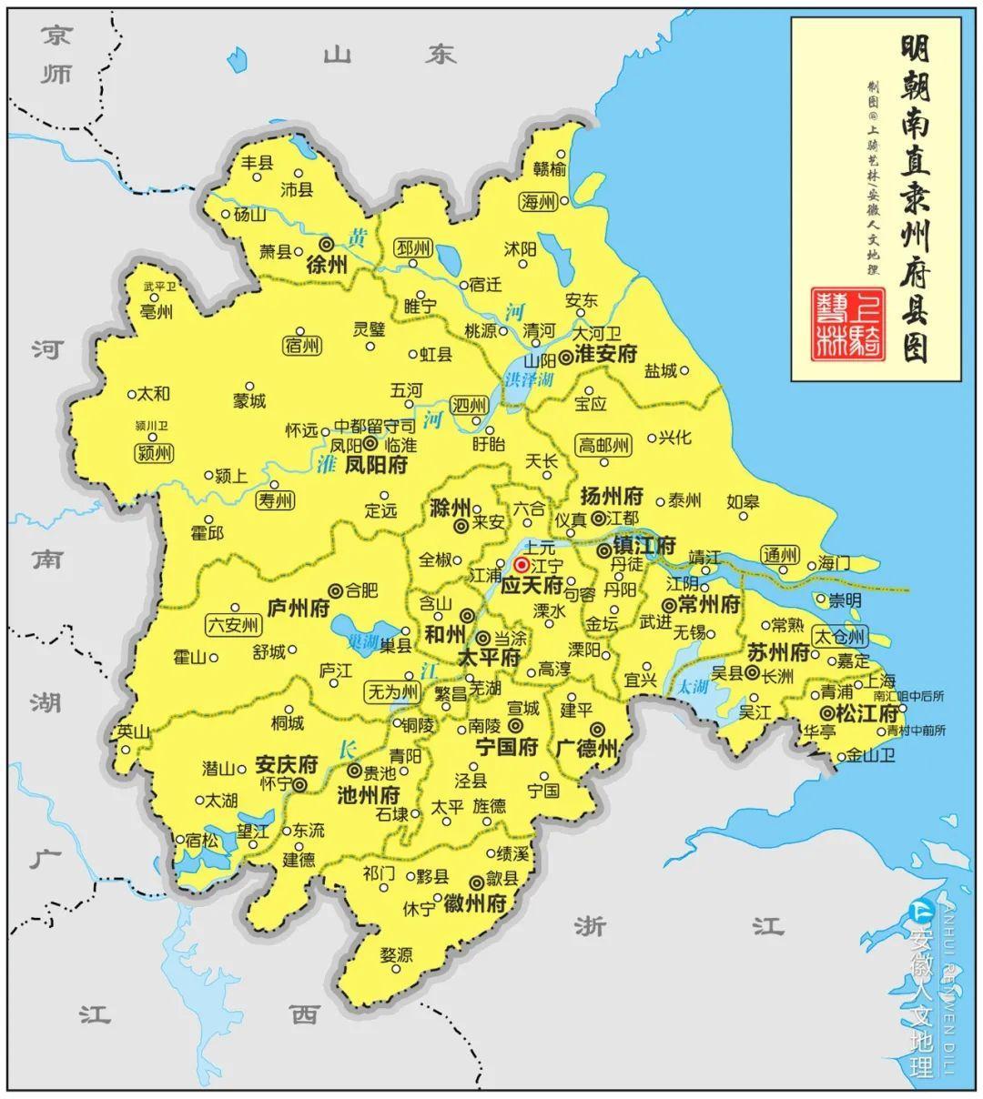直至朱元璋建立明朝定都南京,江蘇安徽兩省順理成章成爲直隸。彼時江蘇境內設有7府,分江南、江北,江南有5府(應天府、蘇州府、松江府、常州府和鎮江府),江北有2府(揚州府、淮安府)。