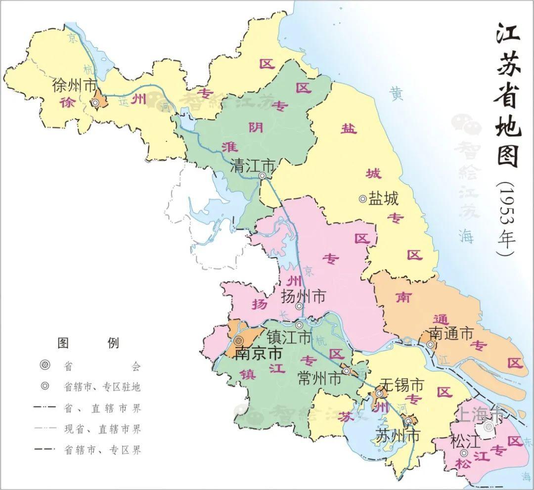 1953年,這三個地區又合成了一個江蘇省,設有6個省轄市(南京、無錫、徐州、常州、蘇州、南通),8個專區(徐州、淮陰、鹽城、揚州、鎮江、蘇州、松江、南通),省會定在南京。