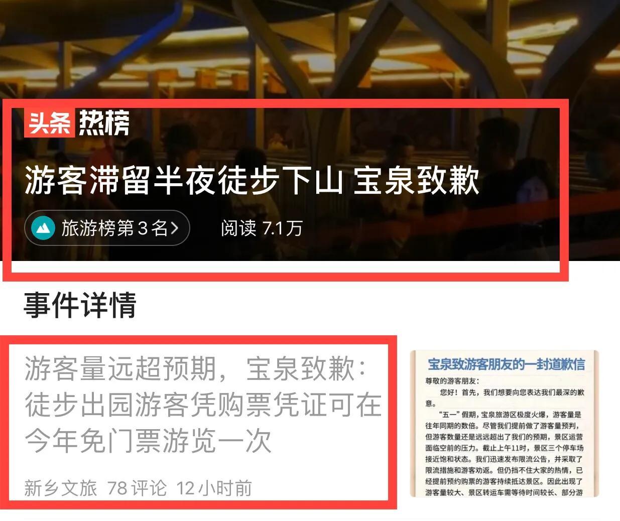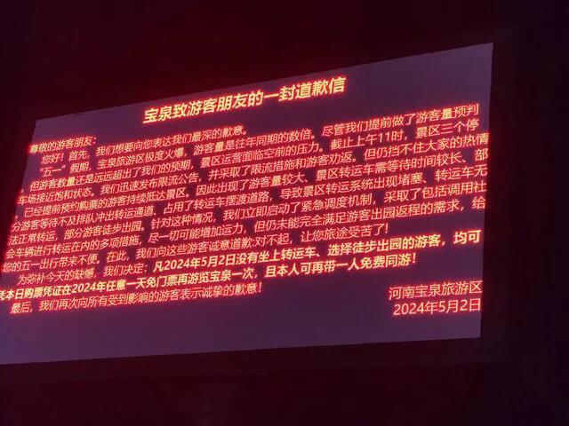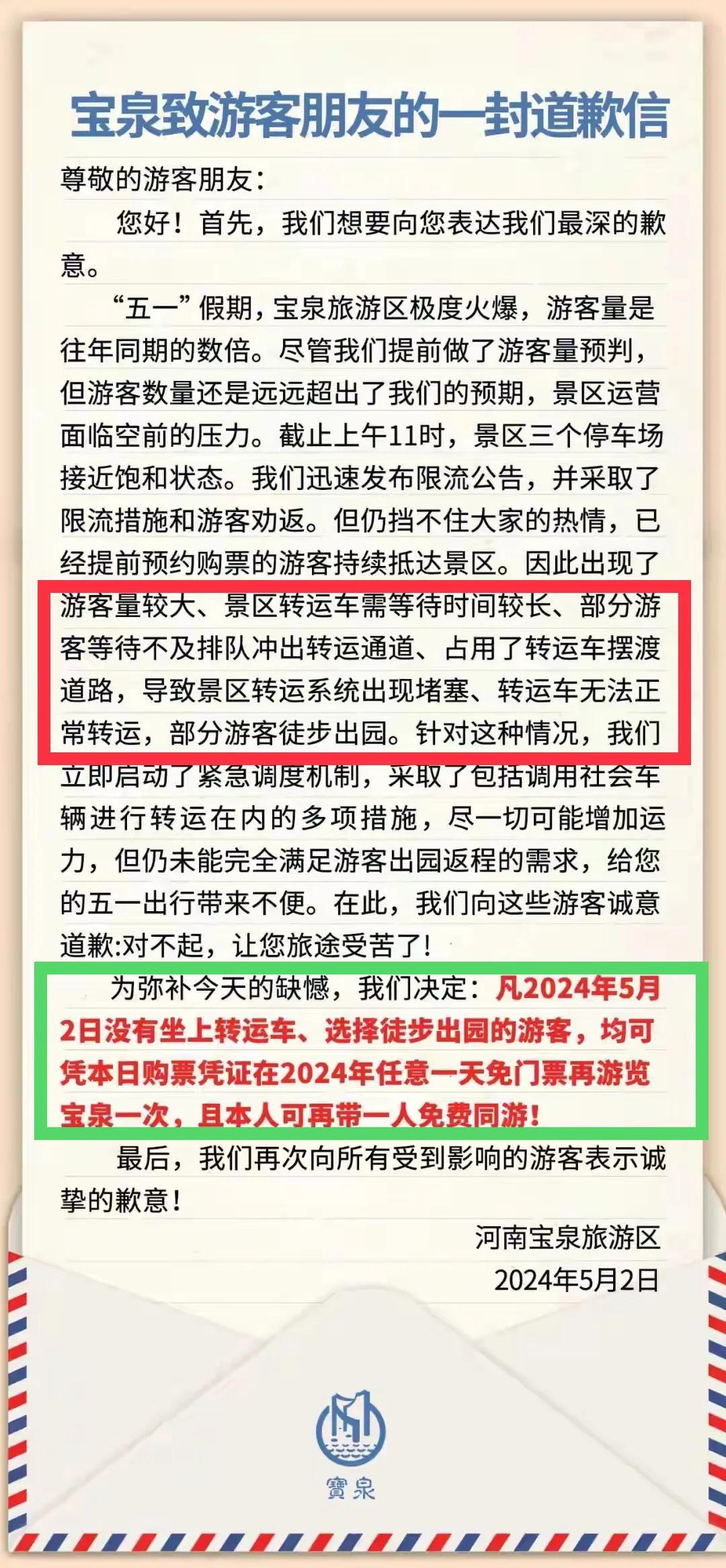 新鄉寶泉旅遊區面對遊客徒步下山,沒有坐上擺渡車的,承諾憑5月2日門票,2024年任意一天可以在免費遊覽因此寶泉旅遊區,(另外一個人還可以在帶一個人免費),並給遊客道歉。