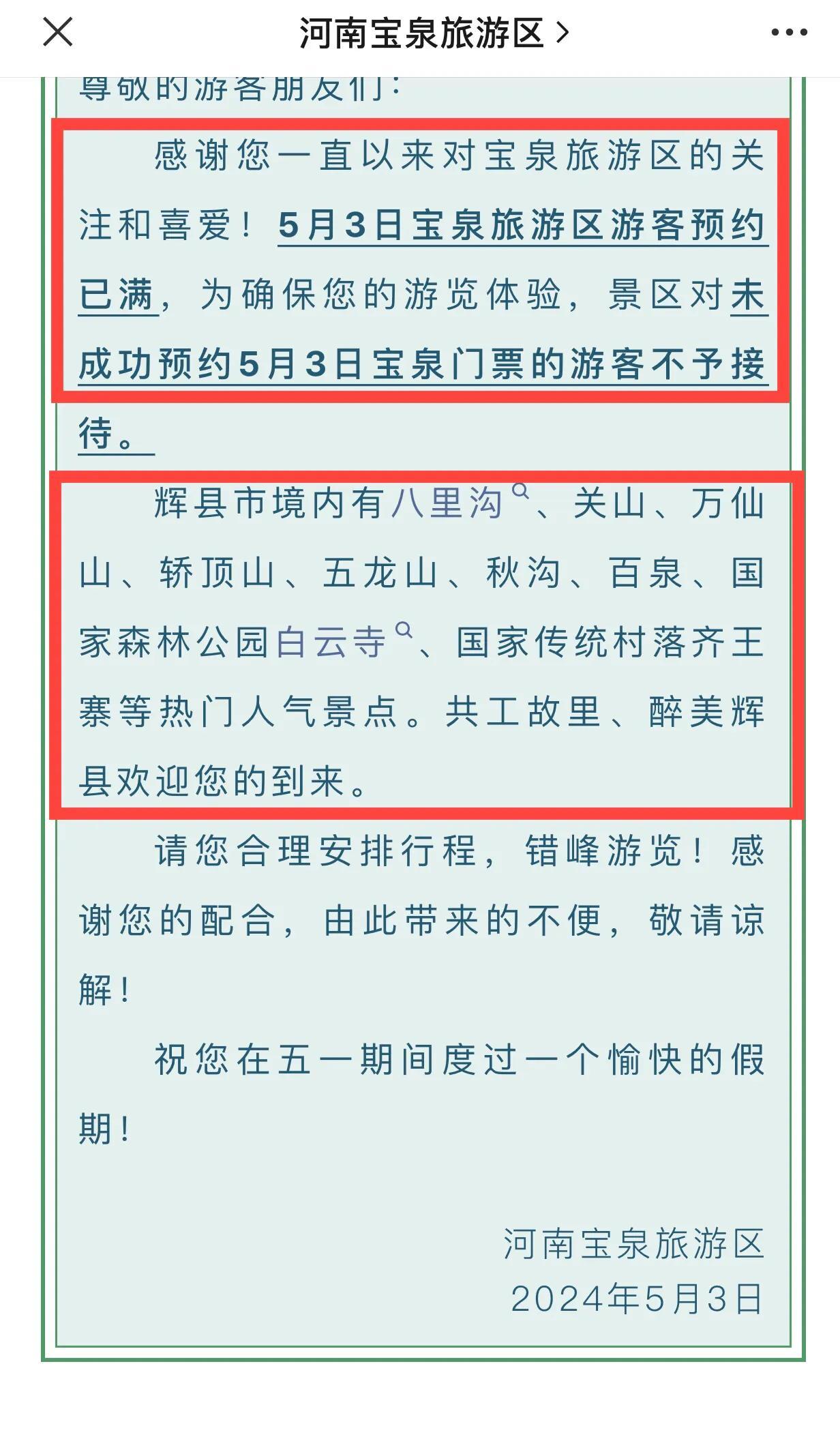5月3日寶泉旅遊區再次發文限流通告,寶泉旅遊區已經預約滿,要求遊客沒能預約上的,可以到附近有八里溝、關山、萬仙山、轎頂山、五龍山、秋溝、百泉、白雲寺、國家傳統村落齊王寨等熱門人氣景點旅遊,等旅遊高峯期過了,再來寶泉旅遊景區遊玩也不遲。