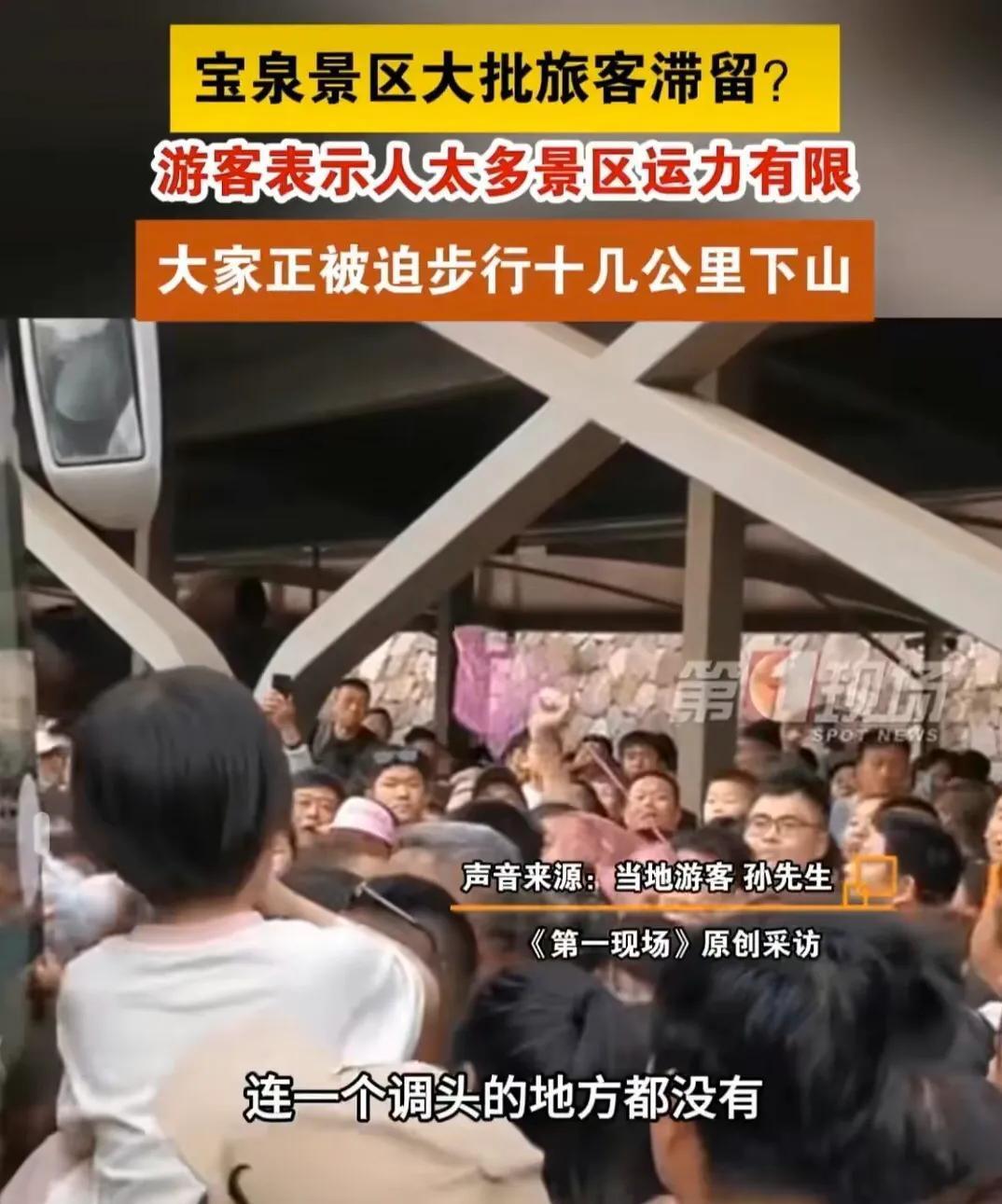 寶泉旅遊區美麗風景,五一假期吸引了來自全國各地遊客,寶泉旅遊區5月2號上午十一點面對遊客大軍壓力,不得不發通告限流,但是爲時已晚,因此就出現了寶泉旅遊區接待能力超限,遊客太多,轉運車一時轉運不過來,遊客焦急下山,遊客坐不上景區擺渡車,直接選擇徒步下山,有遊客說,徒步了三個小時才下山,遊客徒步導致佔據了擺渡車公路,擺渡車無法運營,很多遊客在半夜凌晨還沒出景區,無疑給景區帶來了壓力,也被遊客吐槽服務差的言論。