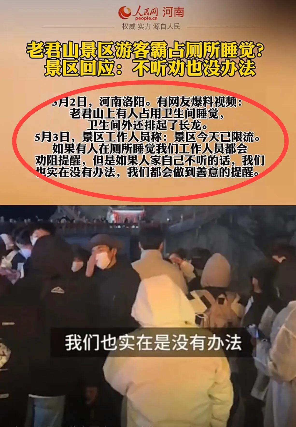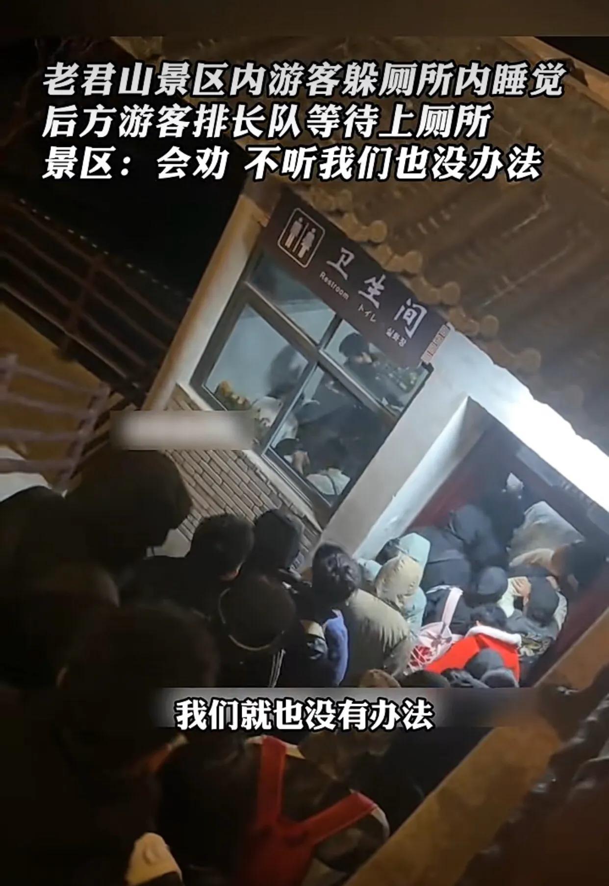 這個五一假期老君山看日出遊客可能較多,然而就發生了一幕,5月2日晚,有人拍視頻爆料有很多遊客把老君山頂廁所佔領了,當夜晚躲避風寒睡覺,從視頻來看廁所已經擠滿了遊客,一些遊客要上廁所被睡覺人站着不讓,導致上不了廁所遊客心急如焚,要上廁所遊客很生氣的吐槽(站着茅坑不拉肚子),視頻衝上熱搜後,老君山景區工作人員回應:如果發現有遊客在廁所睡覺,工作人員會進行勸阻,善意的提醒,但是遊客不聽勸阻,人家要在廁所睡覺不走,景區也沒有辦法。